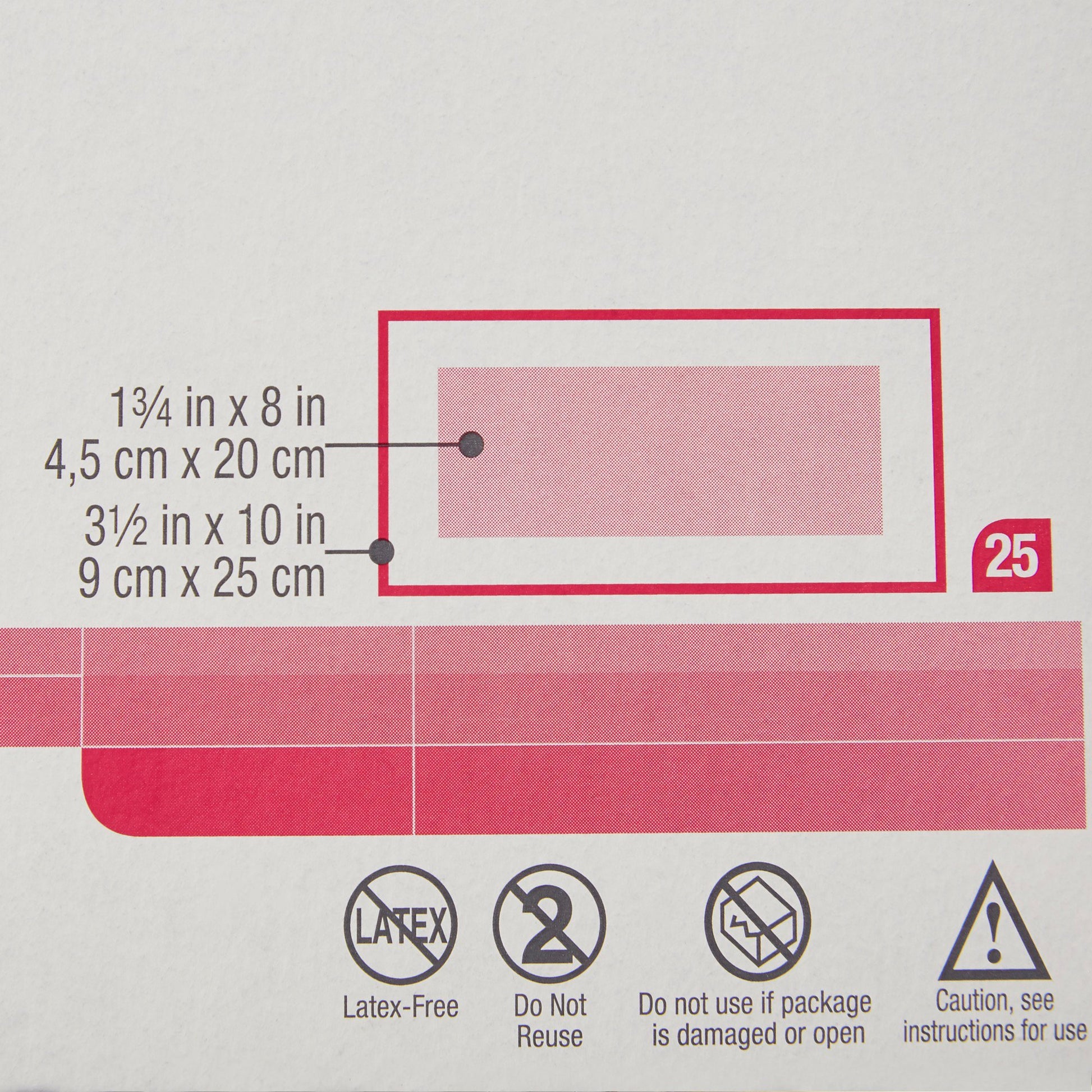 - 3-1/2 x 10 inch adhesive dressing has a 1-3/4 x 8 inch pad.