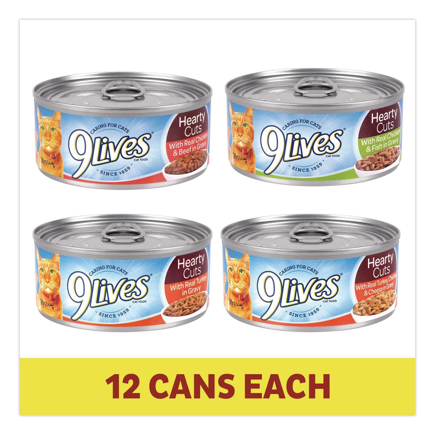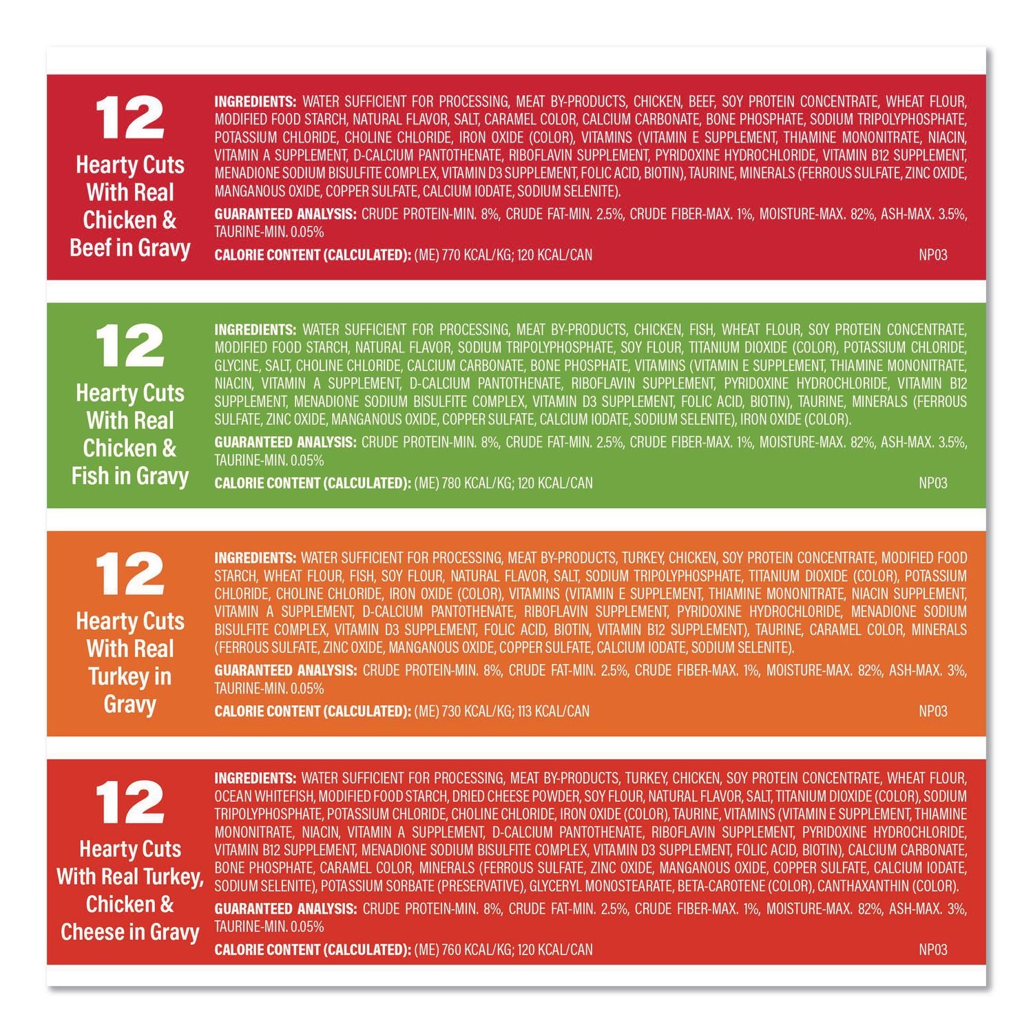 - Flavor: (12) Hearty Cuts with Real Chicken & Beef in Gravy; (12) Hearty Cuts with Real Chicken and Fish in Gravy; (12) Hearty Cuts with Real Turkey in Gravy; (12) Hearty Cuts with Real Turkey Chicken & Cheese in Gravy