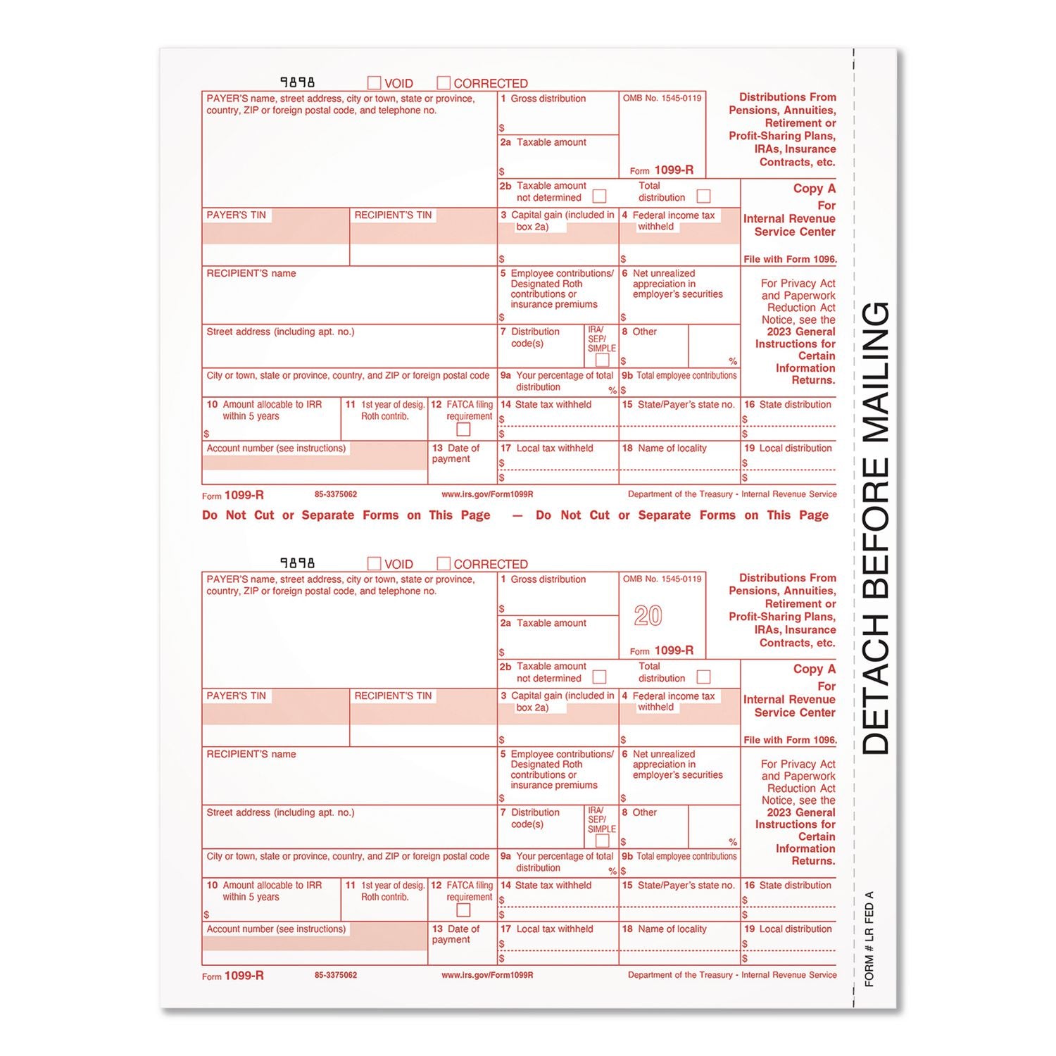 Adams® 2023 1099-R Tax Form, 1 Part, Federal Copy, 2 Forms/Sheet, 50 Forms Total (TOP920103)