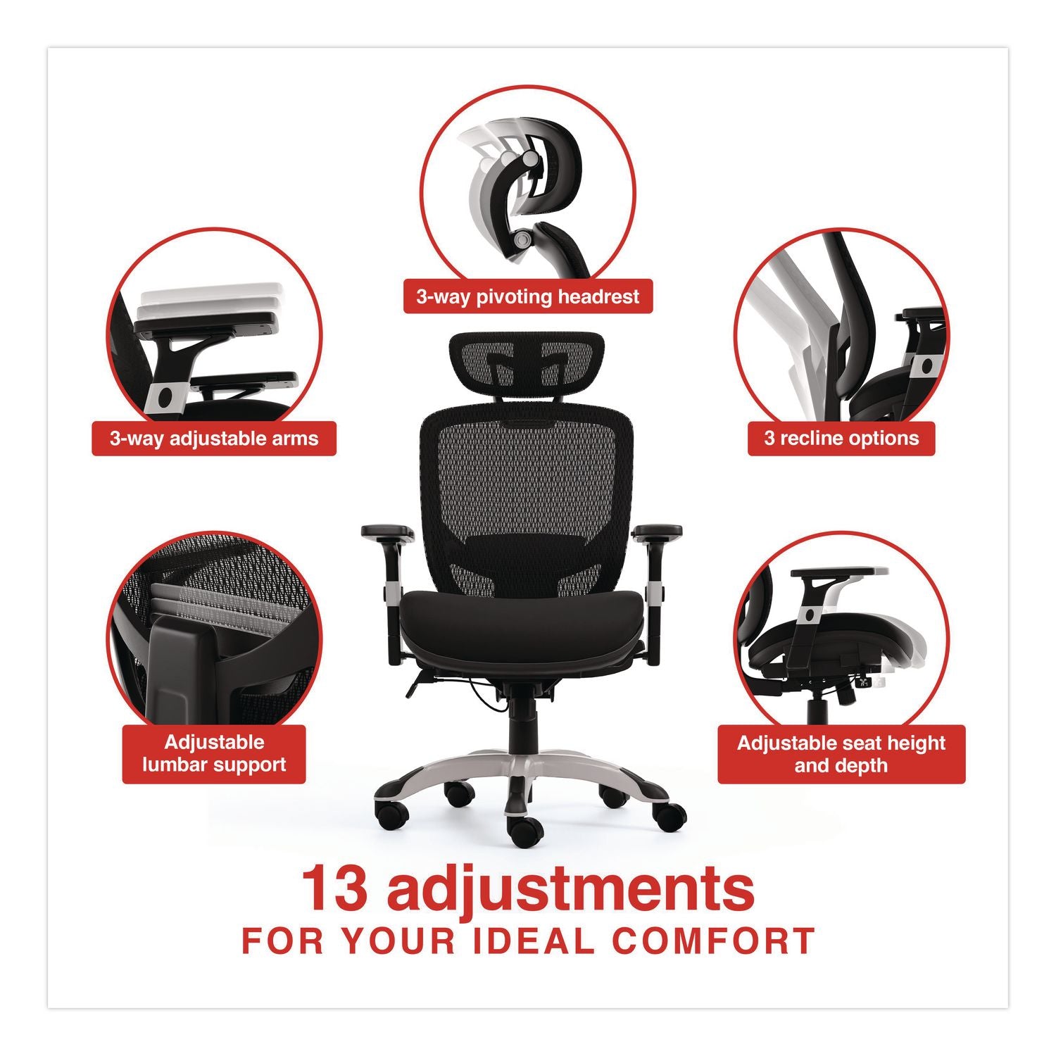 Meet the Alera® Minerva Big & Tall Chair, engineered for superior support, durability, and comfort during your longest workdays. With 13 points of adjustment, this chair adapts to your body for a personalized ergonomic fit. Built with a reinforced frame and tested to support up to 400 lbs, the Minerva Big & Tall combines strength with all-day comfort. Premium features include a three-way pivoting headrest, three-way adjustable armrests, an adjustable lumbar system, customizable seat height and depth, and three recline options—delivering the flexibility you need for lasting comfort. A plush foam seat provides continuous cushioning, while the cradled mesh back ensures cooling airflow and balanced posture. Designed for 8+ hours of daily use, this chair keeps you supported whether you're in meetings or focused on deep work.