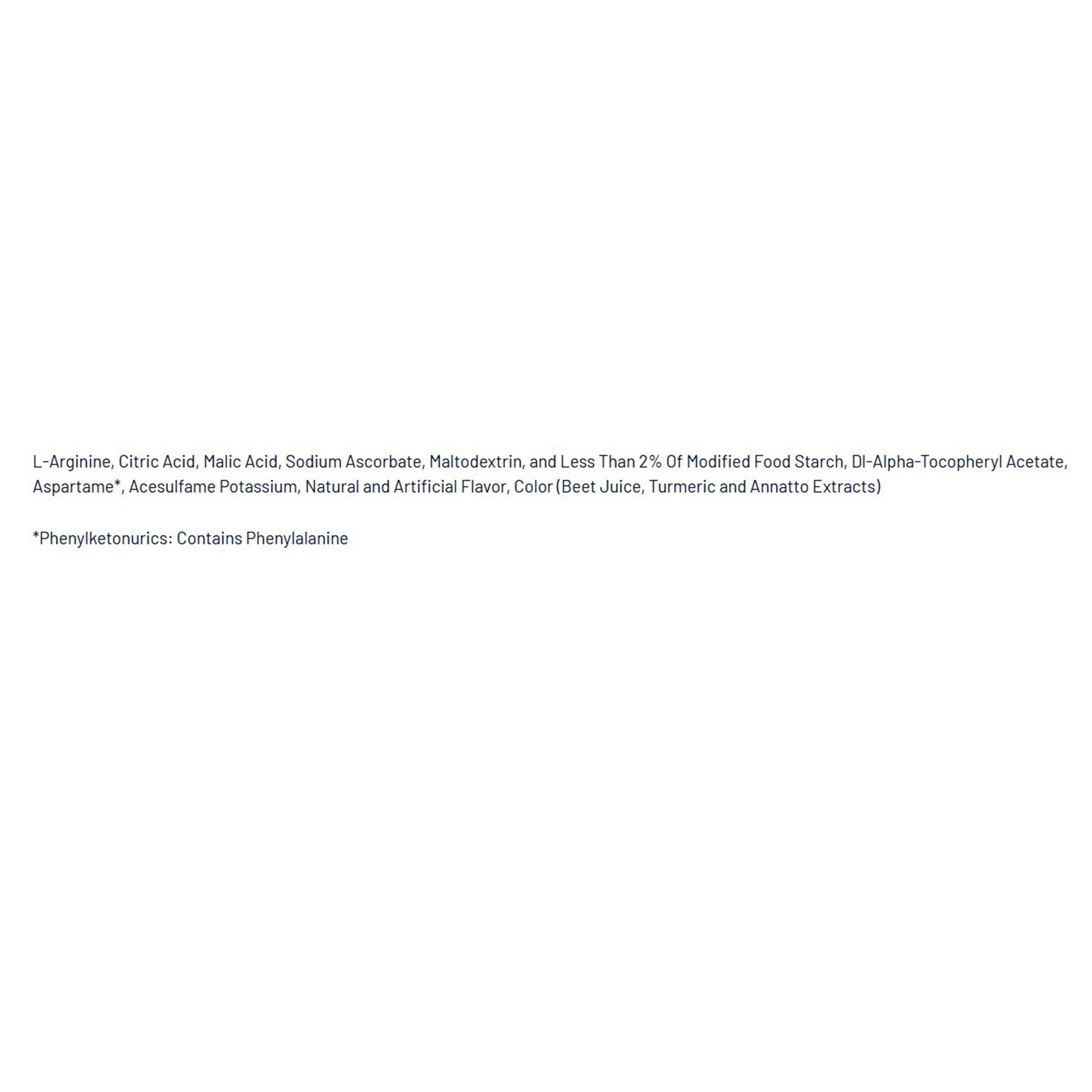 - Ingredients: L-ARGININE, CITRIC ACID, MALIC ACID, SODIUM ASCORBATE, MALTODEXTRIN, AND LESS THAN 2% OF MODIFIED FOOD STARCH, DL-ALPHA-TOCOPHERYL ACETATE, ASPARTAME, ACESULFAME POTASSIUM, NATURAL AND ARTIFICIAL FLAVOR, COLOR (BEET JUICE, TURMERIC AND ANNATTO EXTRACTS)