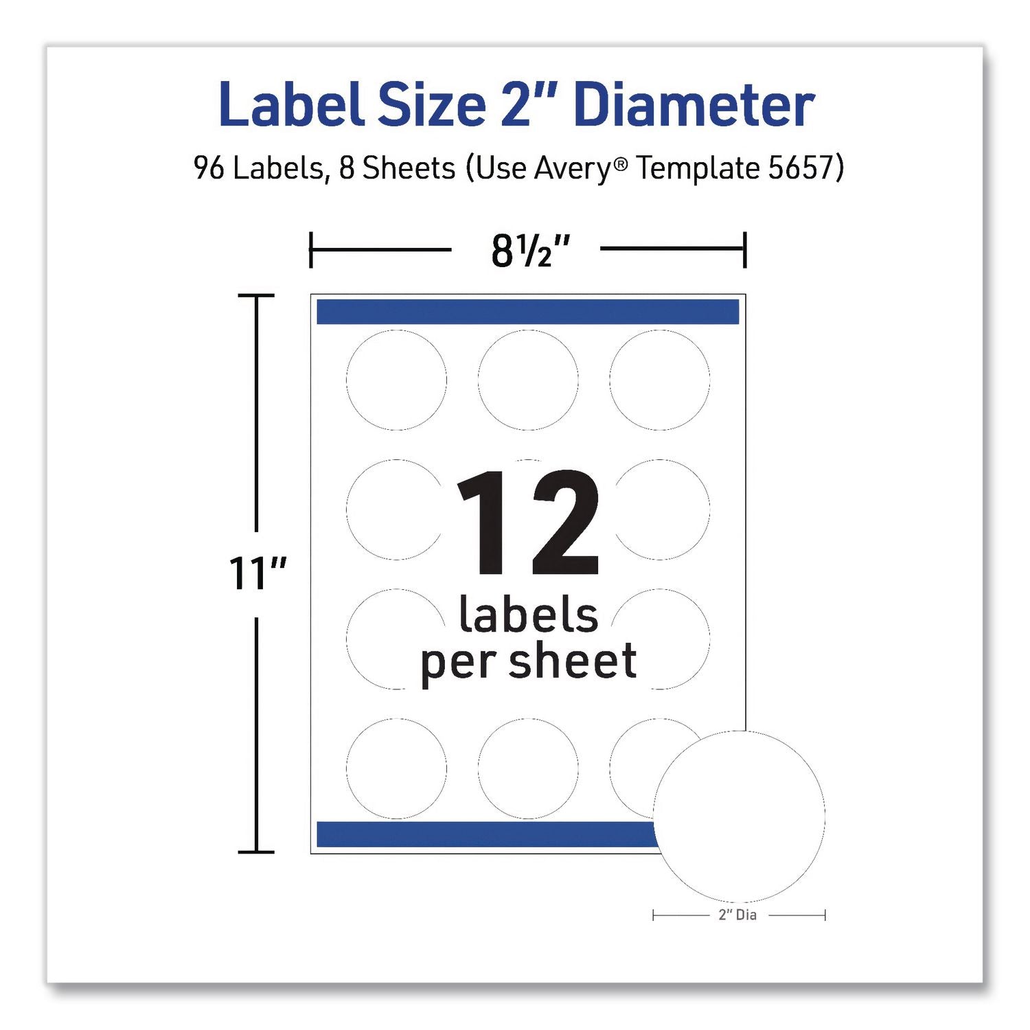 Avery® Waterproof Round Labels with Sure Feed Technology, Laser/Pigment-Based Inkjet, 2" dia, Matte White, 12/Sheet, 8 Sheets/Pack (AVE05657)