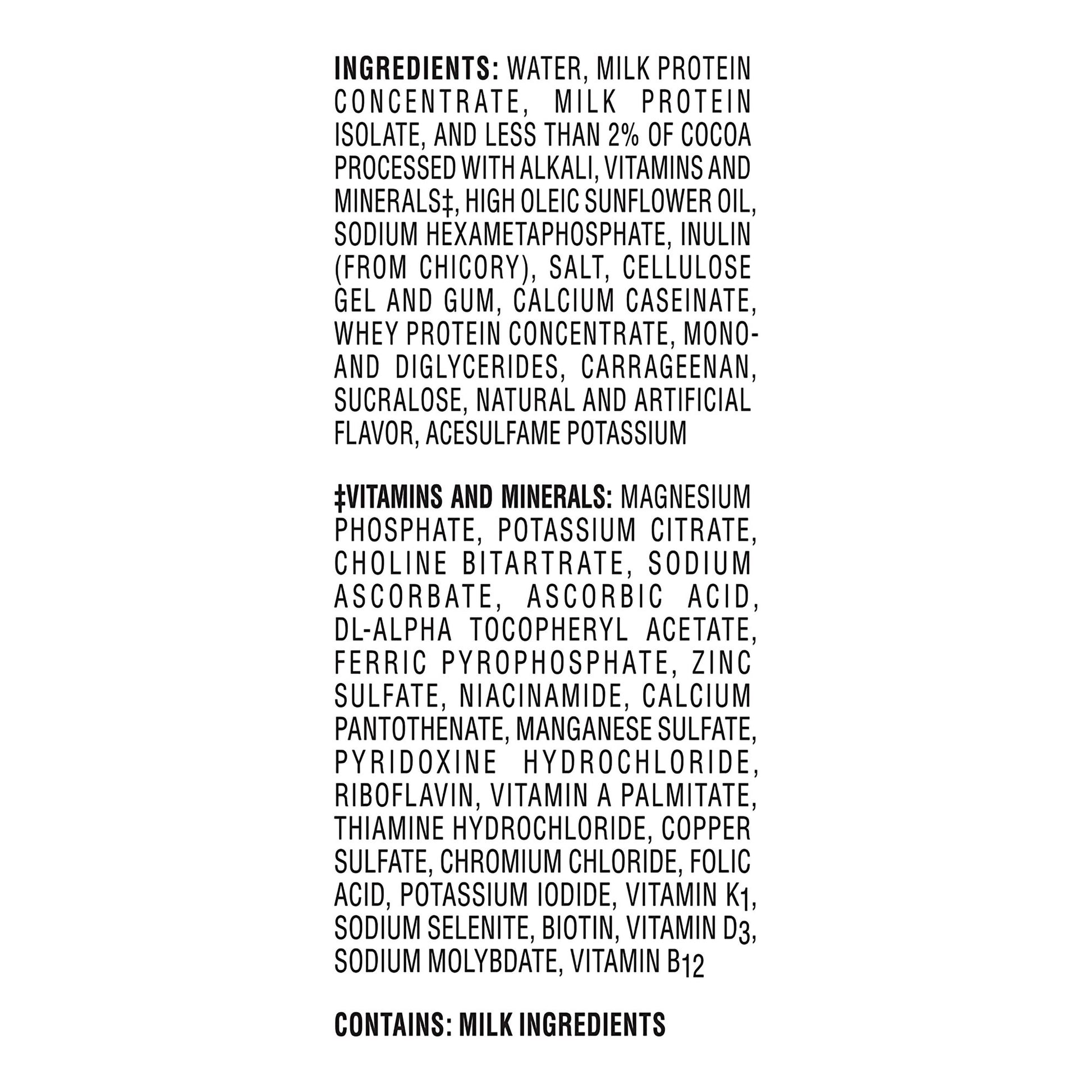 - Ingredients: Water, Milk Protein Concentrate, Milk Protein Isolate, And Less Than 2% Of Cocoa Processed With Alkali, Vitamins And Minerals , High Oleic Sunflower Oil, Sodium Hexametaphosphate, Inulin (From Chicory), Salt, Cellulose Gel And Gum, Calcium Caseinate, Whey Protein Concentrate, Mono- And Diglycerides, Carrageenan, Sucralose, Natural And Artificial Flavor, Acesulfame Potassium Vitamins And Minerals: Magnesium Phosphate, Potassium Citrate, Choline Bitartrate, Sodium Ascorbate, Ascorbic Acid, Dl-Alpha Tocopheryl Acetate, Ferric Pyrophosphate, Zinc Sulfate, Niacinamide, Calcium Pantothenate, Manganese Sulfate, Pyridoxine Hydrochloride, Riboflavin, Vitamin A Palmitate, Thiamine Hydrochloride, Copper Sulfate, Chromium Chloride, Folic Acid, Potassium Iodide, Vitamin K1, Sodium Selenite, Biotin, Vitamin D3, Sodium Molybdate, Vitamin B12 Boost Glucose Control® Max 30 G Protein Vanilla