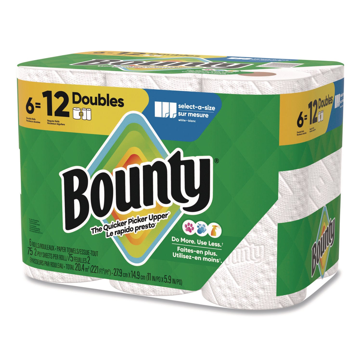 Bounty® Select-a-Size Kitchen Roll Paper Towels, 2-Ply, White, 10.2 x 11, 75 Sheets/Roll, 6 Triple Rolls/Pack (PGC16008)