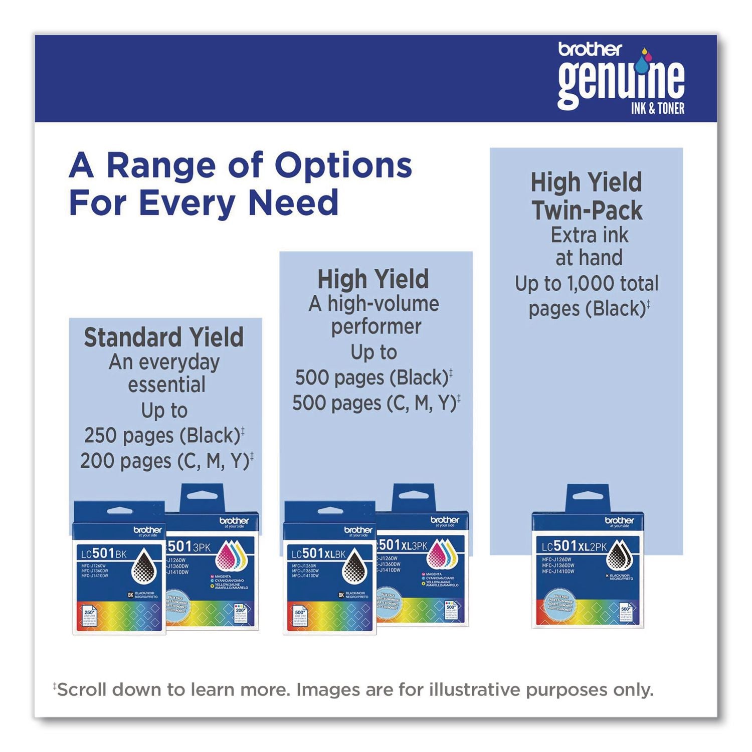 For everything you print, from airline tickets to homework, you can trust Brother Genuine Ink for consistent, premium performance with your Brother printer. The LC501 Standard Yield Ink Cartridges produces bold, sharp prints with rich black for up to 250 pages and vibrant color up to 200 pages. Print Confidently with Brother Genuine LC501 Ink in your Work Smart 1260, 1360 or 1410 – the only brand we recommend for your Brother printer.