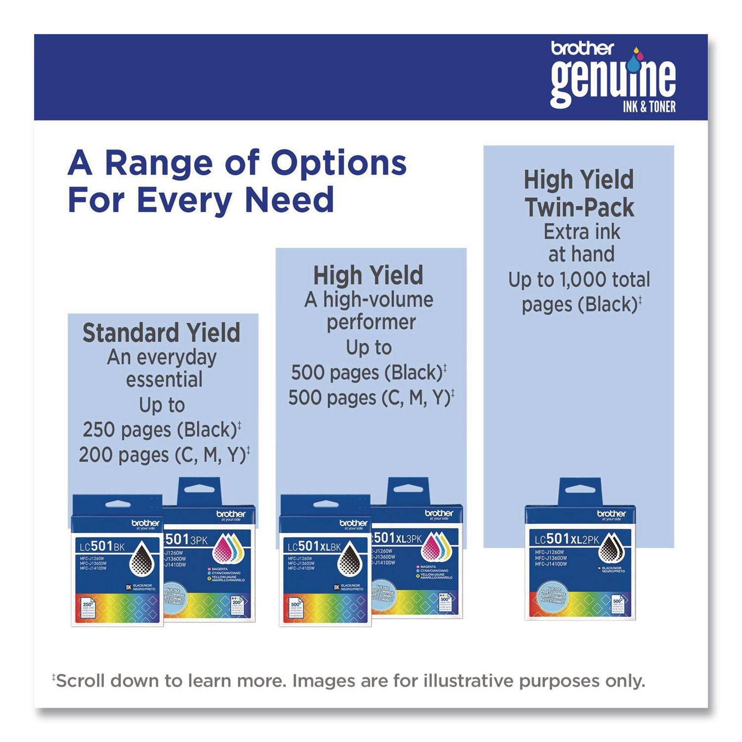 Improve your efficiency – get more ink and fewer interruptions with high yield cartridges. For everything you print, from airline tickets to homework, you can trust Brother Genuine Ink for consistent, premium performance with your Brother printer. The high yield ink cartridges produce bold, sharp prints with rich black for up to 500 pages each and vibrant, sharp prints with rich color for up to 500 pages. Print Confidently with Brother Genuine LC501 Ink in your Work Smart MFC-J1260DW, MFC-J1360DW, or MFC-J1410DW – the only brand we recommend for your Brother printer.