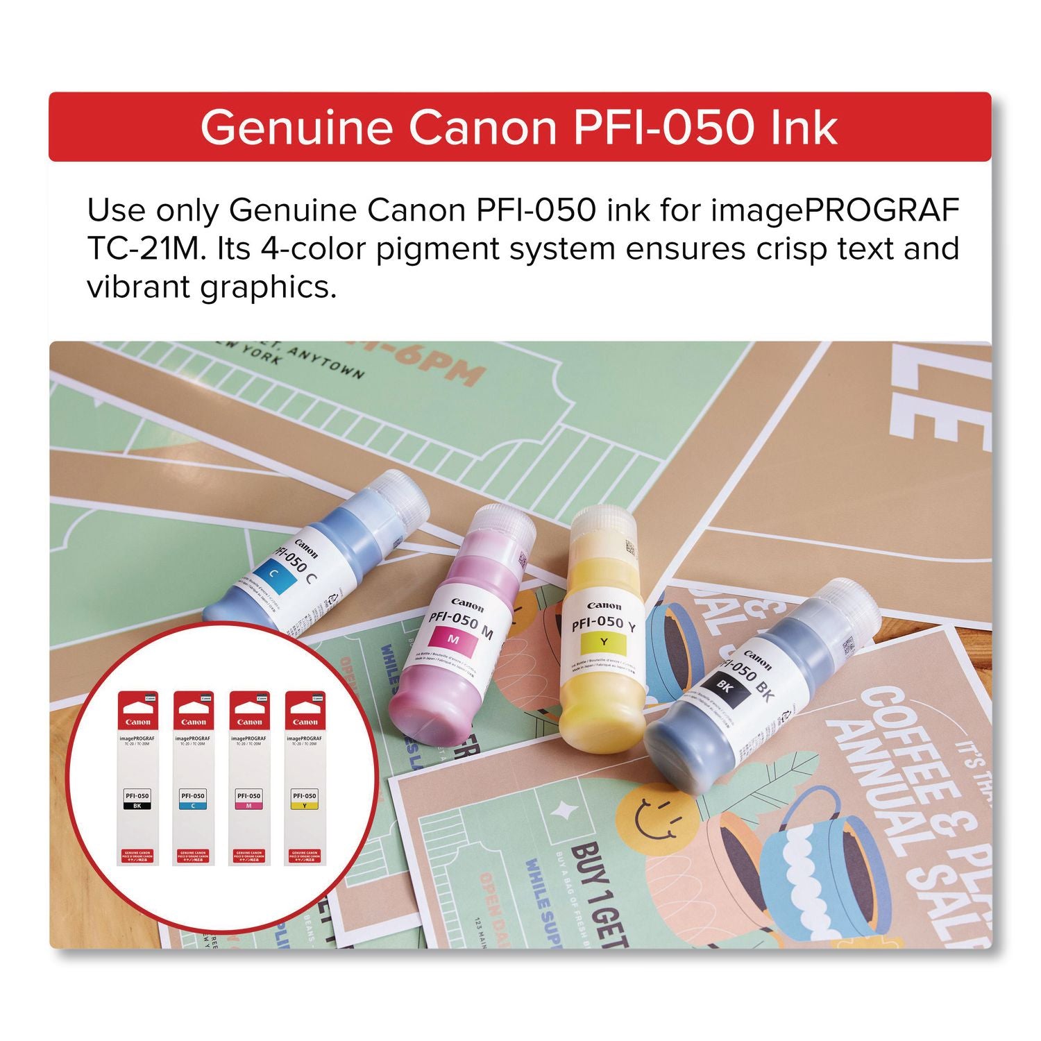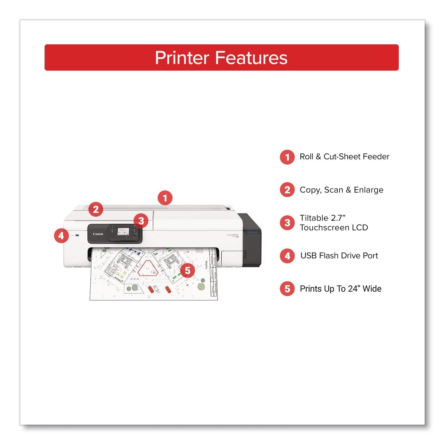 The imagePROGRAF TC-21M printer is designed to provide the versatility that users need to create high-quality posters, banners, CAD drawings, labels and more. Ideal for education, home offices, grocery stores, healthcare, architectural, construction environments and more. This all-around and versatile large format printer can print on compatible roll media up to 24" wide or print labels as well as letter/A4 to A1 size prints from the Automatic Sheet Feeder. The TC-21M simplifies the process of enlarging smaller originals with its flatbed scanner feature, allowing direct enlargements in just a few steps. It gives the ability to quickly make prints from a USB drive via the USB drive port. With the inclusion of 280 ml of ink—four 70 ml per ink bottle—the TC-21M sets itself apart by offering the largest ink capacity in its class, providing users the ability to print more without frequent refills.