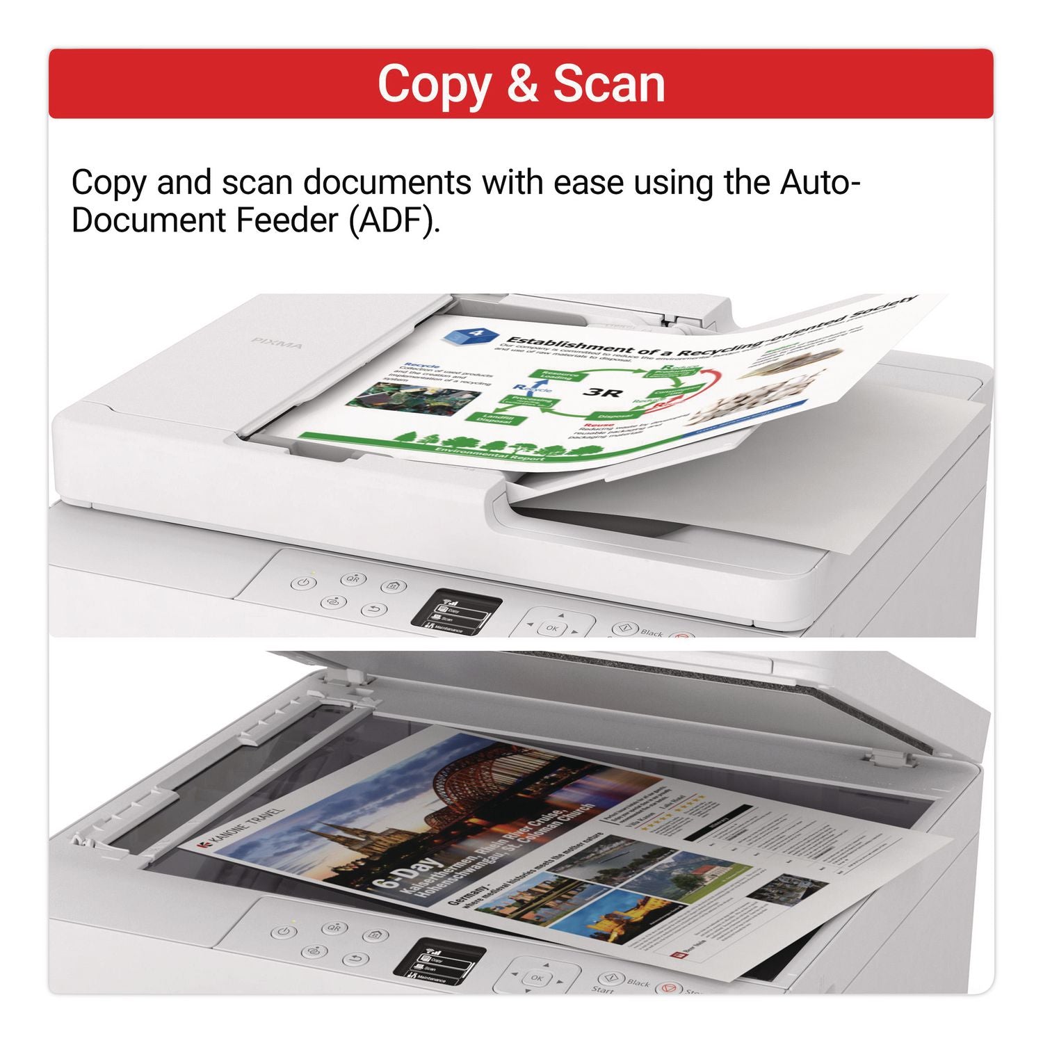 The PIXMA TR7120 is an excellent and feature-rich printer for home users who require more than basic printing capabilities. It includes an Auto Document Feeder (ADF) for scanning and copying multi-page documents with ease, auto 2-sided printing to save paper, and a 1.42" OLED display for intuitive navigation.