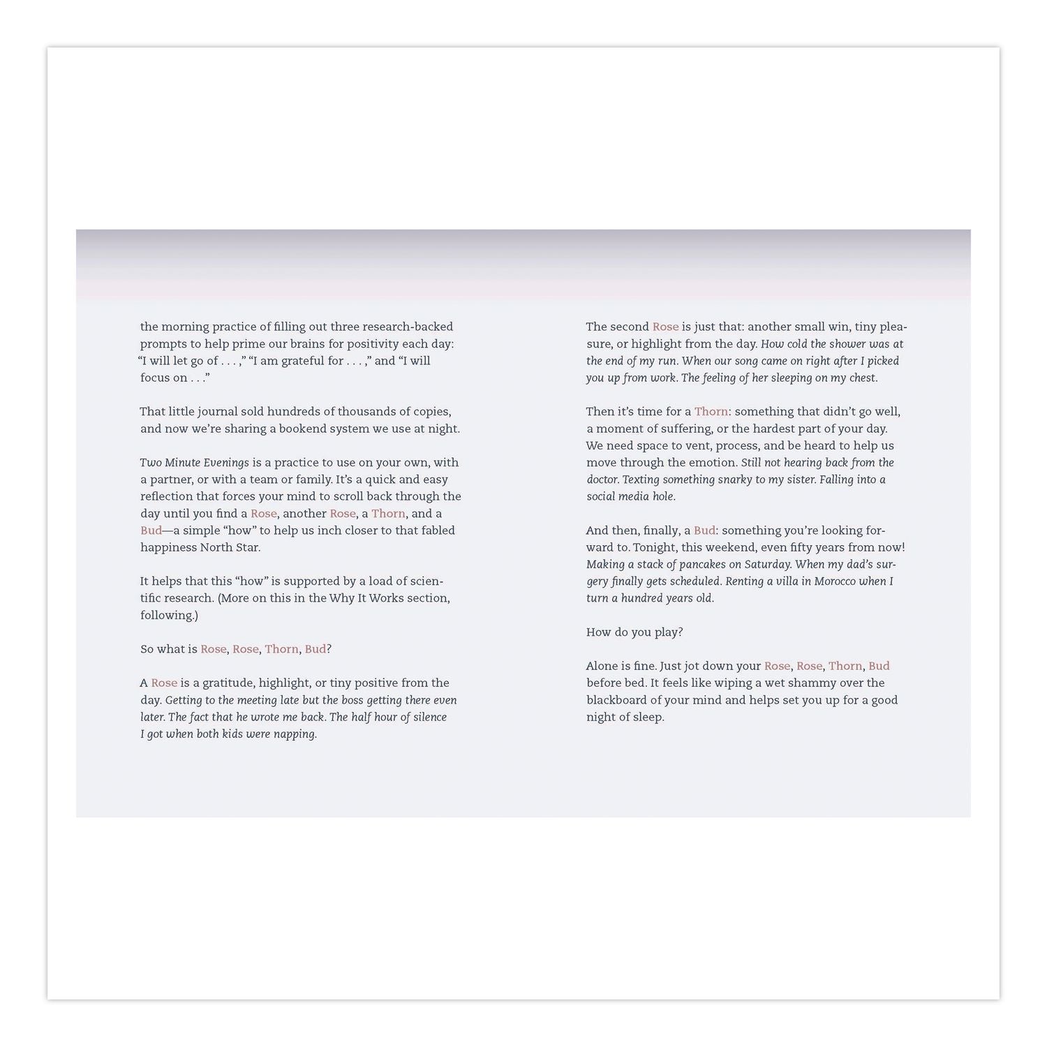 From the acclaimed author of the bestselling Two Minute Mornings, Neil Pasricha's calming follow-up: Two Minute Evenings - Wind Down Your Day with Intention, encourages reflection while offering a quick and easy way to let go of stress and build good sleeping habits. Use its easy-to-follow thinking and writing prompts to focus the mind, establish a practice of gratitude and cultivate happiness. Drawn from psychological research, it delivers an effective way to scroll back through your day.