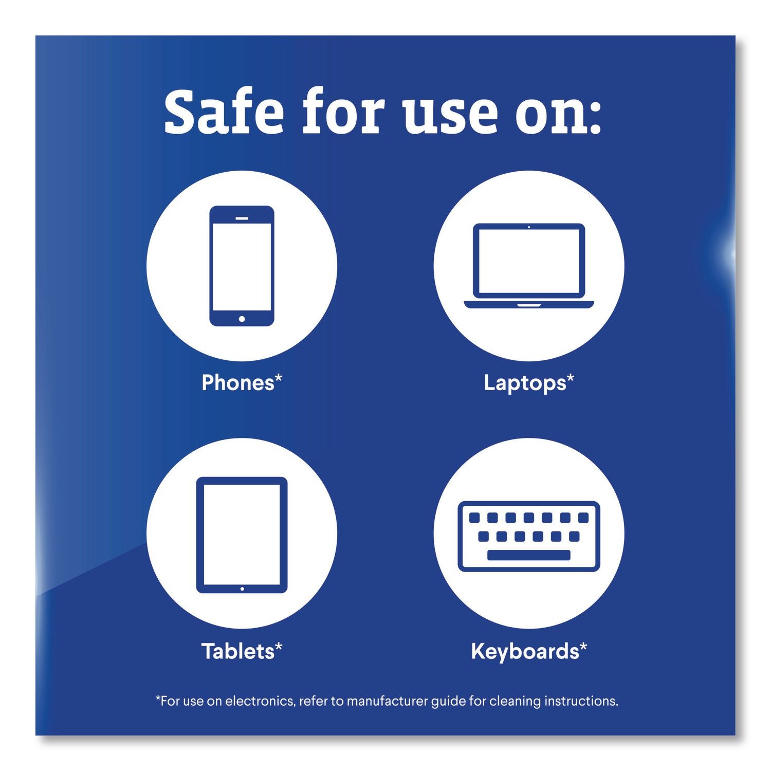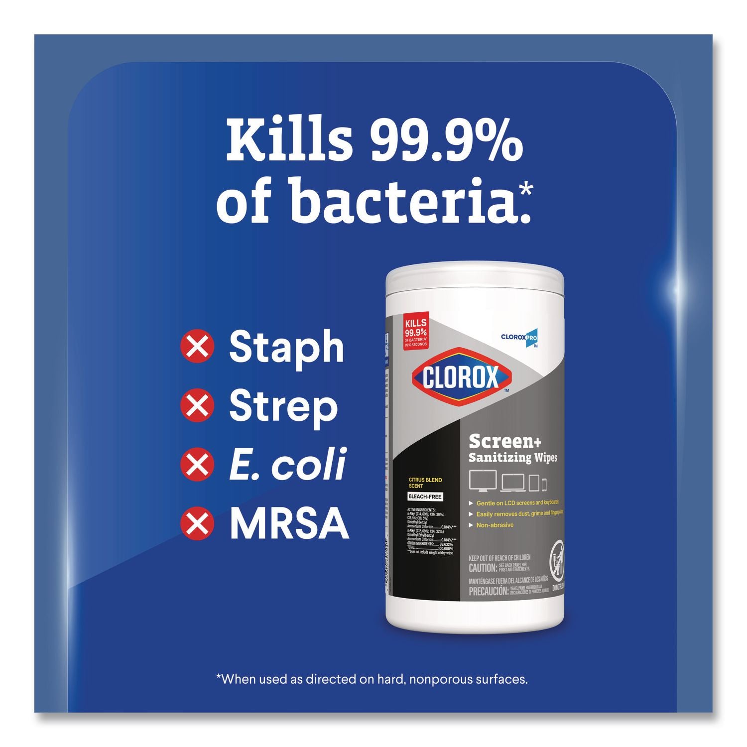 Share screens, not bacteria with CloroxPro® Clorox® Screen+ Sanitizing Wipes. These one-step cleaning and sanitizing wipes are EPA registered to kill 99.9% of bacteria in 10 seconds. The bleach-free, non-abrasive formula in these electronic wipes easily removes dust, grime and fingerprints and is safe to use on screens, laptops, phones, tablets, keyboards and other delicate electronics. Whether you need clean tablets for the classroom or a dust-free monitor in the office, these electronic screen wipes are as advanced as today's technology. Do not flush. For surfaces that incorporate electronic components, please consult manufacturer's instructions.
