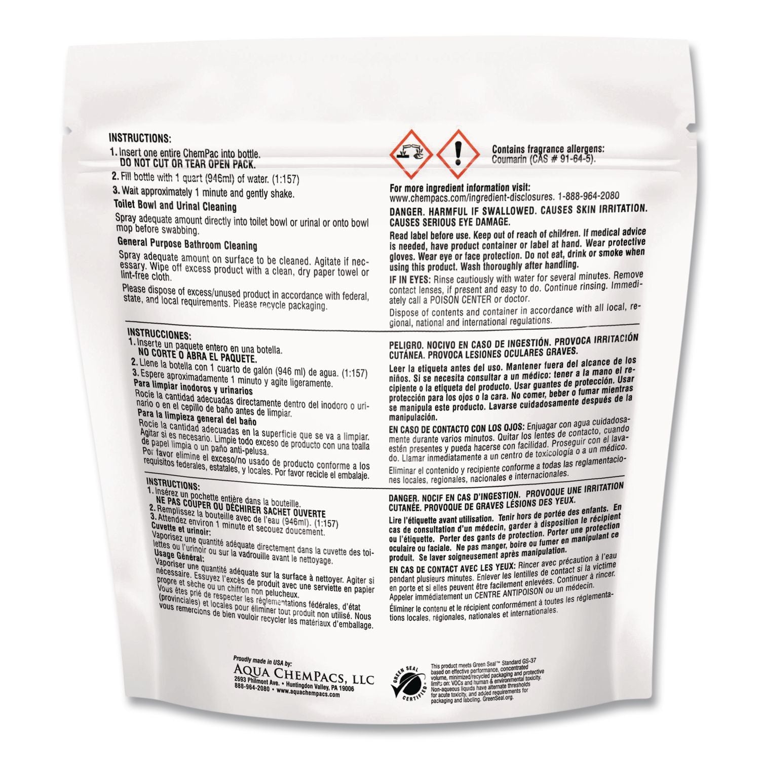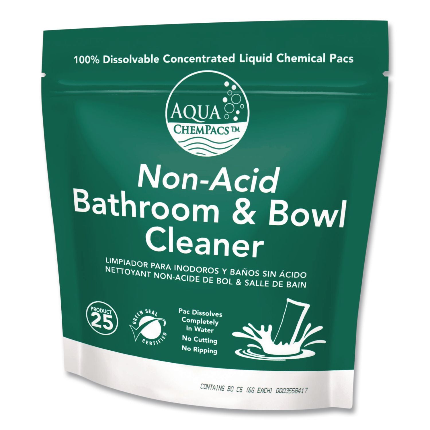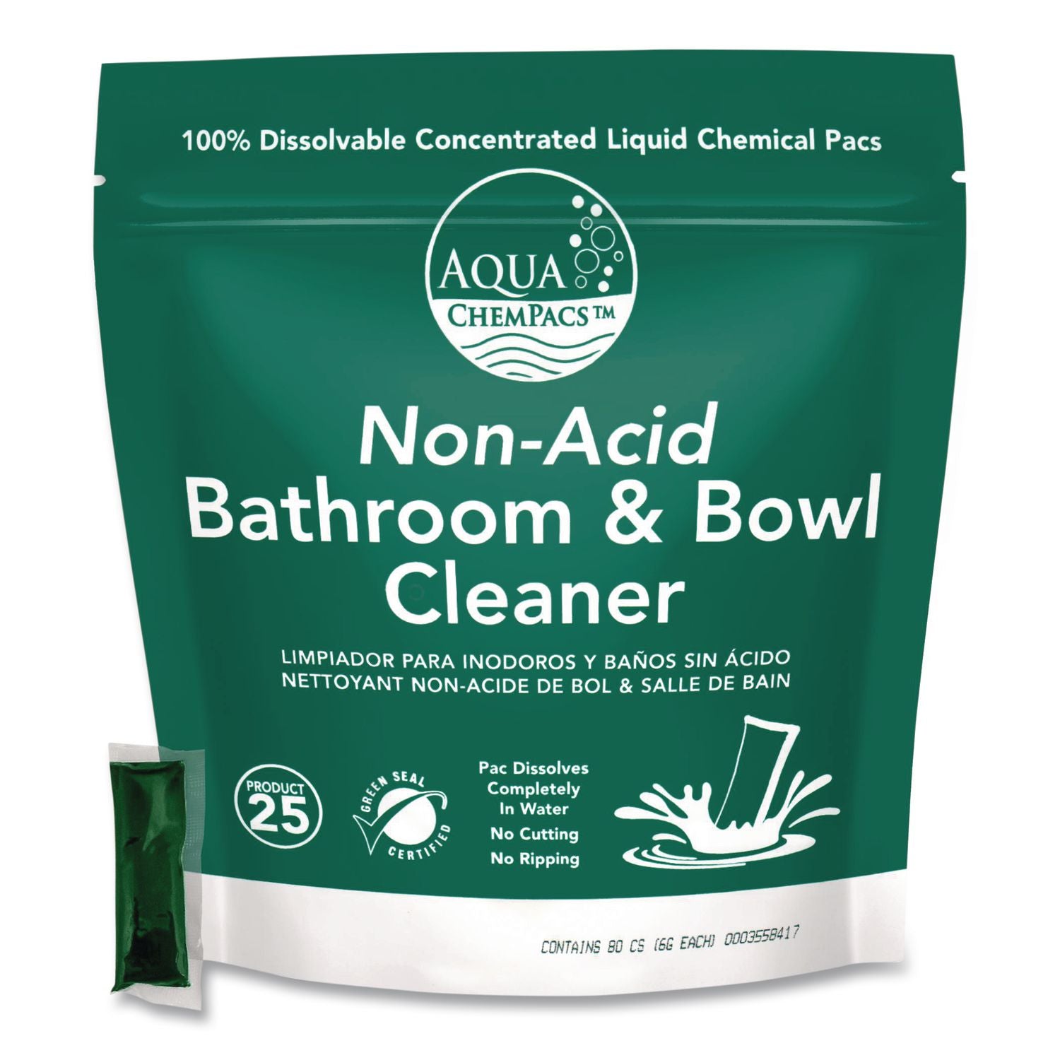 This Aqua ChemPacs™ Non-Acid Bathroom and Bowl Cleaner quickly combats water deposits and other sediments without harsh acids or caustic chemicals. Effectively cleans and deodorizes toilet bowls, urinals, basins, tubs and tile. Pre-measured pacs make it easy to use with no chemical contact.