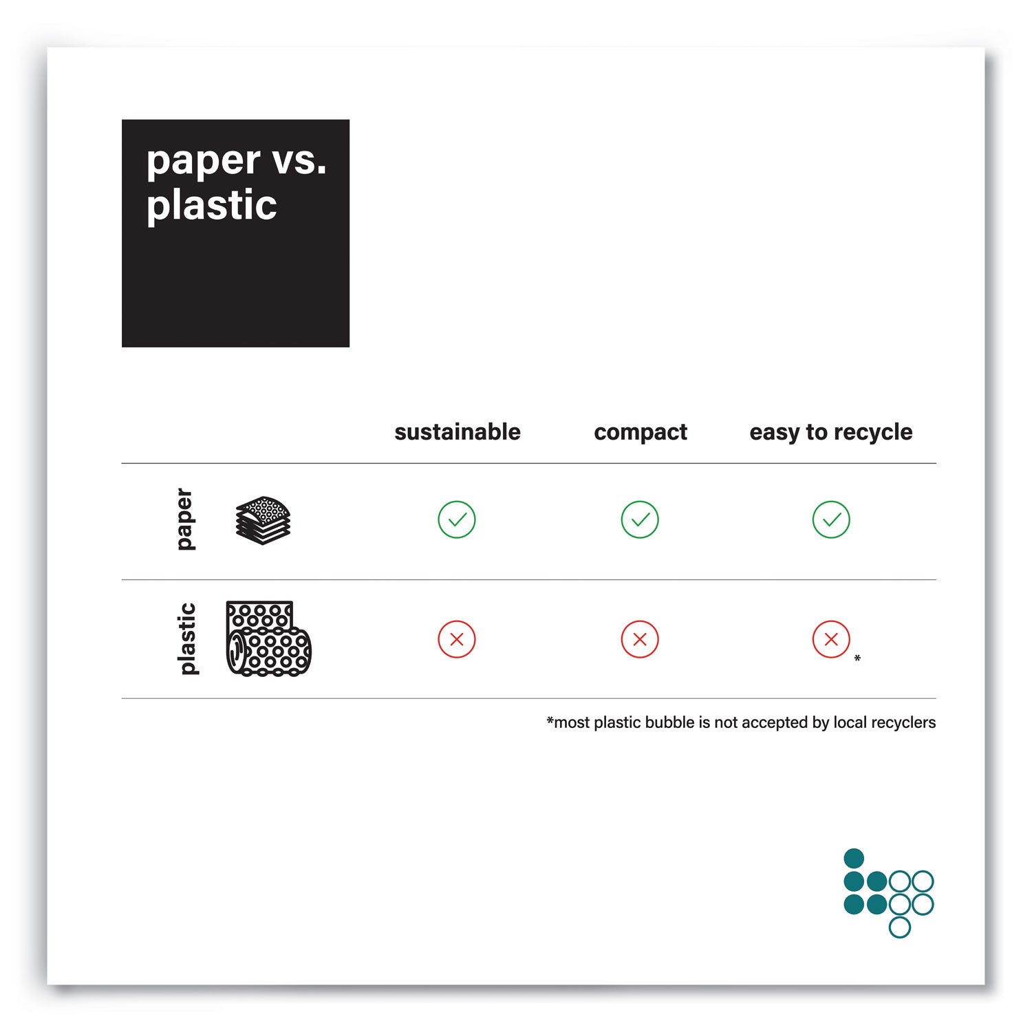 Bubble Paper is a curbside recyclable replacement for plastic bubble wrap. With a sturdy kraft paper construction, you don't have to worry about your goods moving around during shipping or during a move. The bundle is perforated every 12" and fan-folds in a compact design that takes up less space than traditional bubble wrap (think about those giant rolls of plastic wrap!).