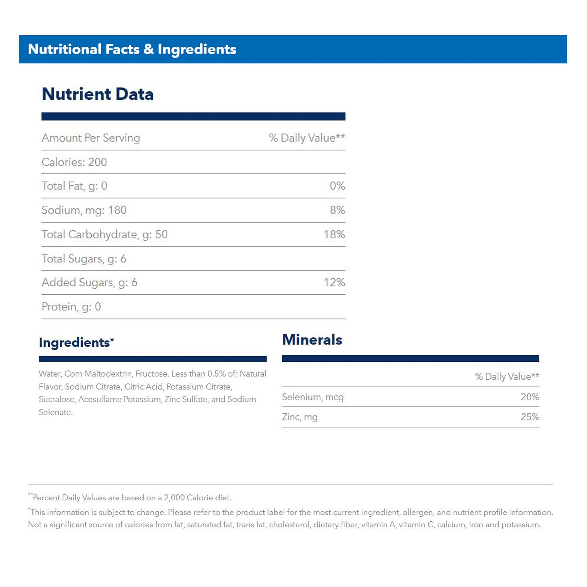 - Ingredients: Water, Corn Maltodextrin, Fructose. Less than 0.5% of: Natural Flavor, Sodium Citrate, Citric Acid, Potassium Citrate, Sucralose, Acesulfame Potassium, Zinc Sulfate, and Sodium Selenate