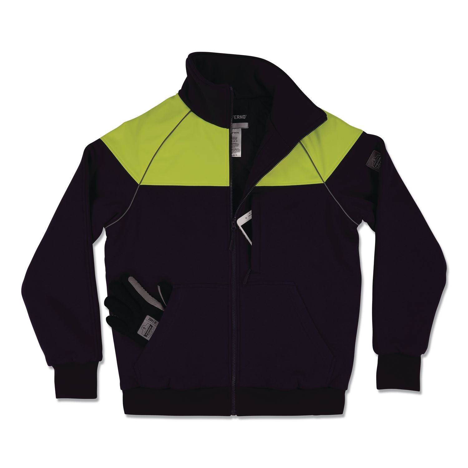 The N-Ferno 6474 Insulated Cooler Jacket is rated to -10°F/-23°C conditions for up to five hours of moderate work activity in cooler cold storage facilities. Designed with triple-layer insultation and 80 g of polyfill, this jacket delivers warmth, comfort and durability. The upper section is crafted with 300 g 75D softshell material, providing wind-resistant protection, while the lower section is made with 330 g sweatshirt material for a relaxed, comfortable fit that allows for extended, non-bulky wear. The sweatshirt also features a soft polyester jersey lining that offers a cozy feel against the skin. For added functionality, the jacket features Tri-Hex grips on the forearms for secure box handling and a high collar to shield your neck from the cold. Oversized pockets offer plenty of storage and easy access, even with gloves on. Rib knit cuffs with thumb holes and heavy-duty zippers lock out wind and cold, keeping you warm and comfortable all day. Reflective accents, including large areas of lime and reflective piping, enhance visibility in low-light conditions, making it suitable for safety-conscious environments. The cooler jacket is machine washable for easy and convenient care. Ideal for those working in cold storage facilities, whether in a cooler or freezer room. Also designed for outdoor workers in any industry, from construction to mining and outdoor recreational activities such as hiking or snowmobiling.