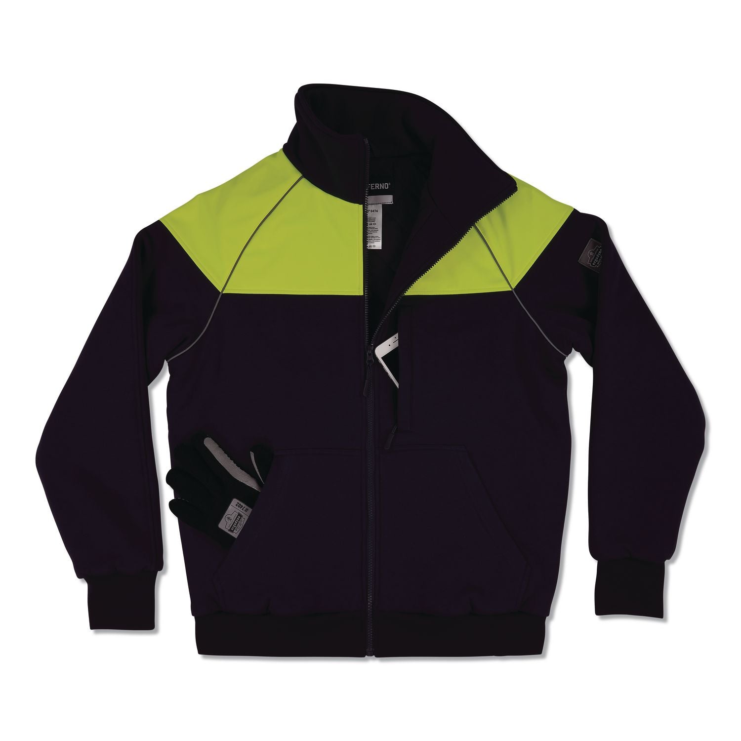 The N-Ferno 6474 Insulated Cooler Jacket is rated to -10°F/-23°C conditions for up to five hours of moderate work activity in cooler cold storage facilities. Designed with triple-layer insultation and 80 g of polyfill, this jacket delivers warmth, comfort and durability. The upper section is crafted with 300 g 75D softshell material, providing wind-resistant protection, while the lower section is made with 330 g sweatshirt material for a relaxed, comfortable fit that allows for extended, non-bulky wear. The sweatshirt also features a soft polyester jersey lining that offers a cozy feel against the skin. For added functionality, the jacket features Tri-Hex grips on the forearms for secure box handling and a high collar to shield your neck from the cold. Oversized pockets offer plenty of storage and easy access, even with gloves on. Rib knit cuffs with thumb holes and heavy-duty zippers lock out wind and cold, keeping you warm and comfortable all day. Reflective accents, including large areas of lime and reflective piping, enhance visibility in low-light conditions, making it suitable for safety-conscious environments. The cooler jacket is machine washable for easy and convenient care. Ideal for those working in cold storage facilities, whether in a cooler or freezer room. Also designed for outdoor workers in any industry, from construction to mining and outdoor recreational activities such as hiking or snowmobiling.