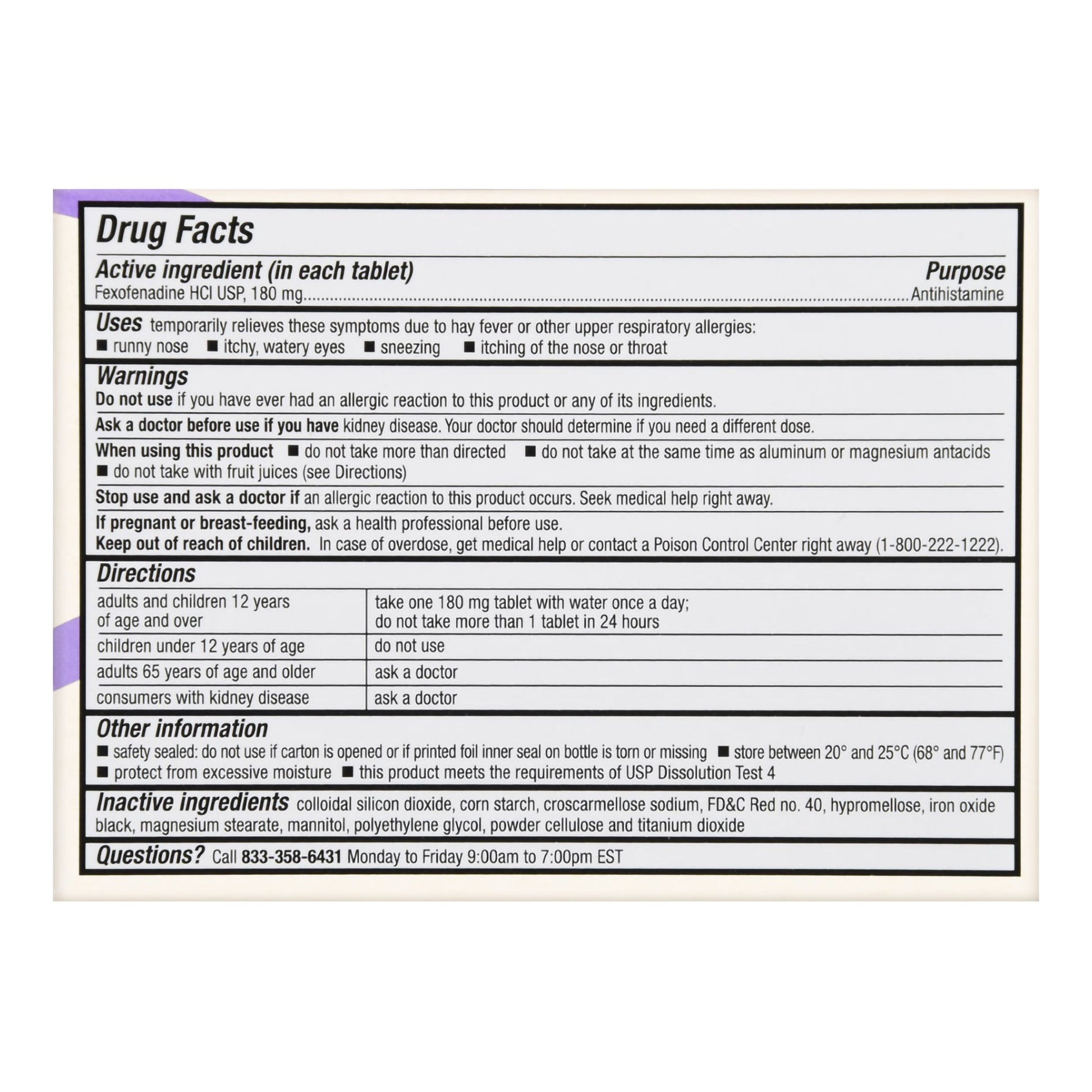 - Active Ingredients: Fexofenadine HCl
