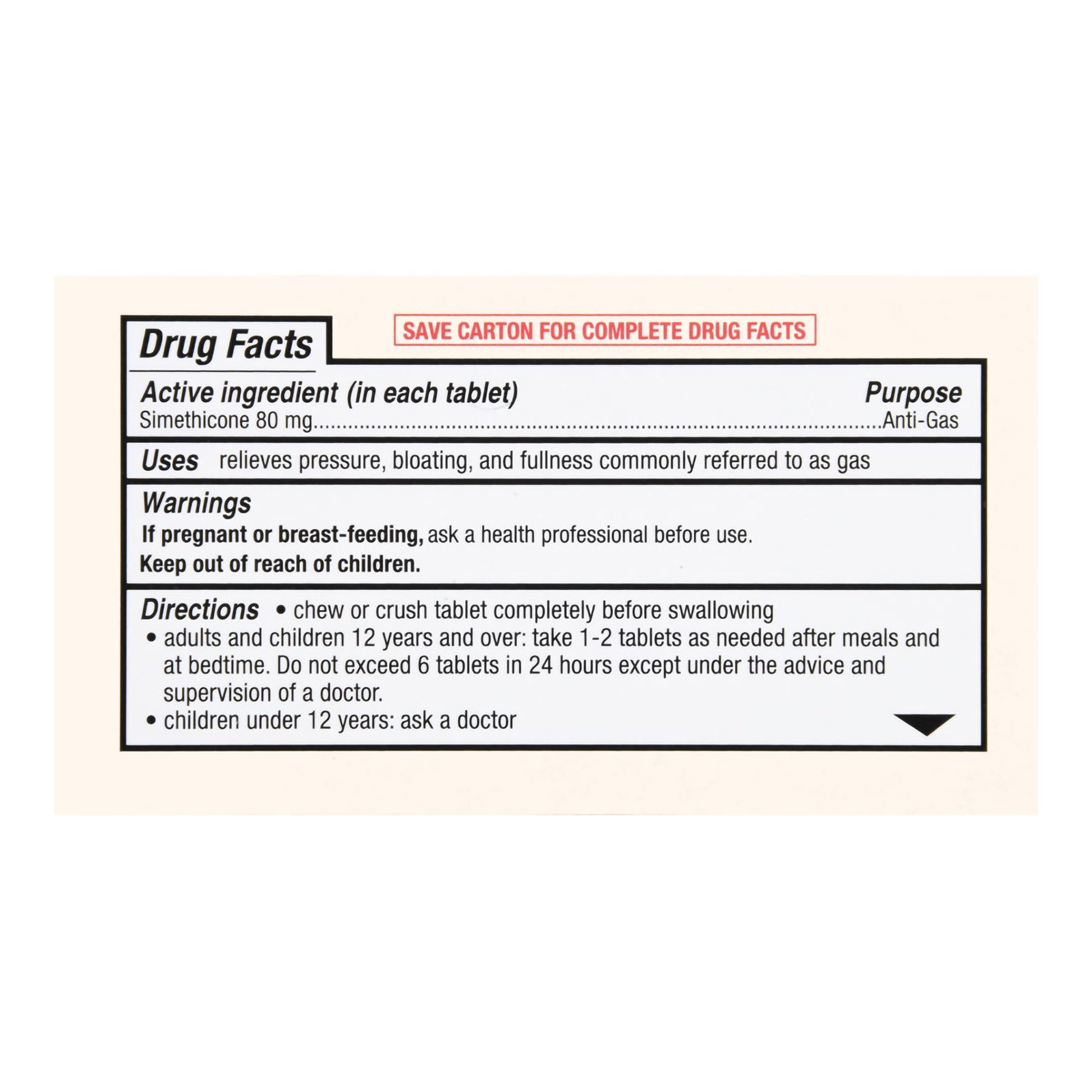- Each tablet has 80 milligrams of simethicone to disperse gas bubbles in your stomach and intestines