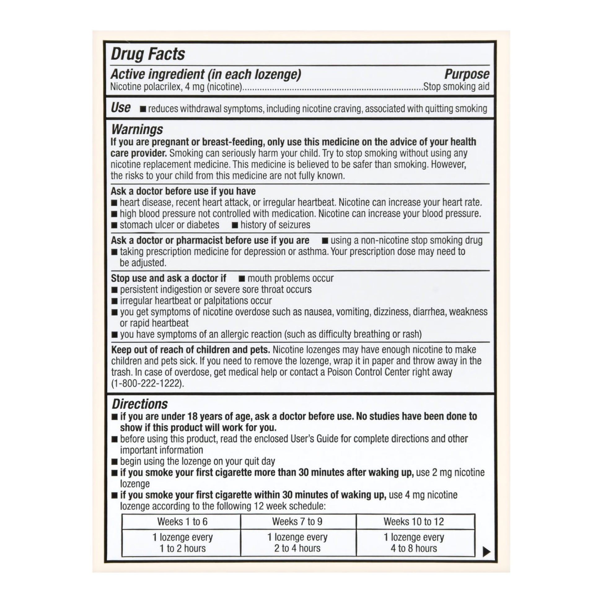 - Each lozenge contains 4 mg of nicotine polacrilex (equal to 4 mg nicotine)