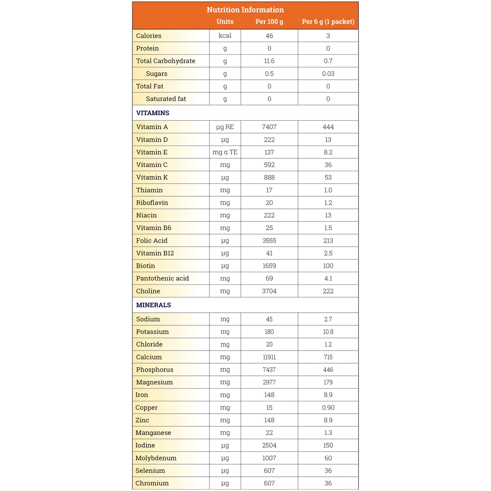 - Ingredients: Calcium Phosphate, Magnesium Sulfate, Magnesium Phosphate, Choline Bitartrate, Natural and Artificial Flavor, Citric Acid, Xanthan Gum, Ascorbic Acid, Beta Carotene (Color), Ferrous Sulfate, DL[1]Alpha Tocopherol Acetate, Zinc Sulfate, Acesulfame Potassium, Niacinamide, Biotin, Sucralose, Vitamin D3, Calcium Pantothenate, Vitamin A Acetate, Manganese Sulfate, Sodium Selenite, Vitamin B12, Copper Sulfate, Potassium Iodide, Pyridoxine Hydrochloride, Thiamine Hydrochloride, Riboflavin, Vitamin K1, Folic Acid, Chromium Chloride, Sodium Molybdate