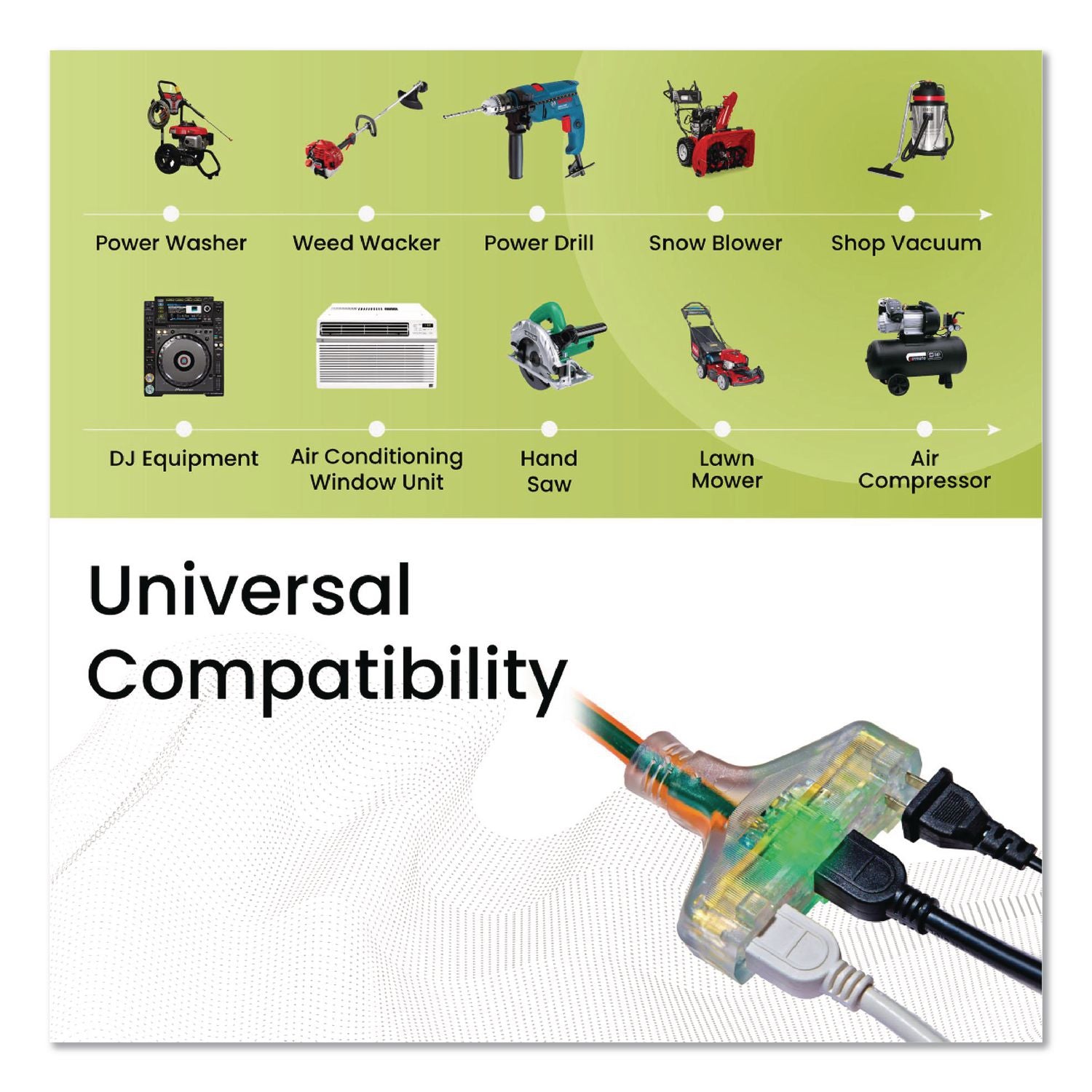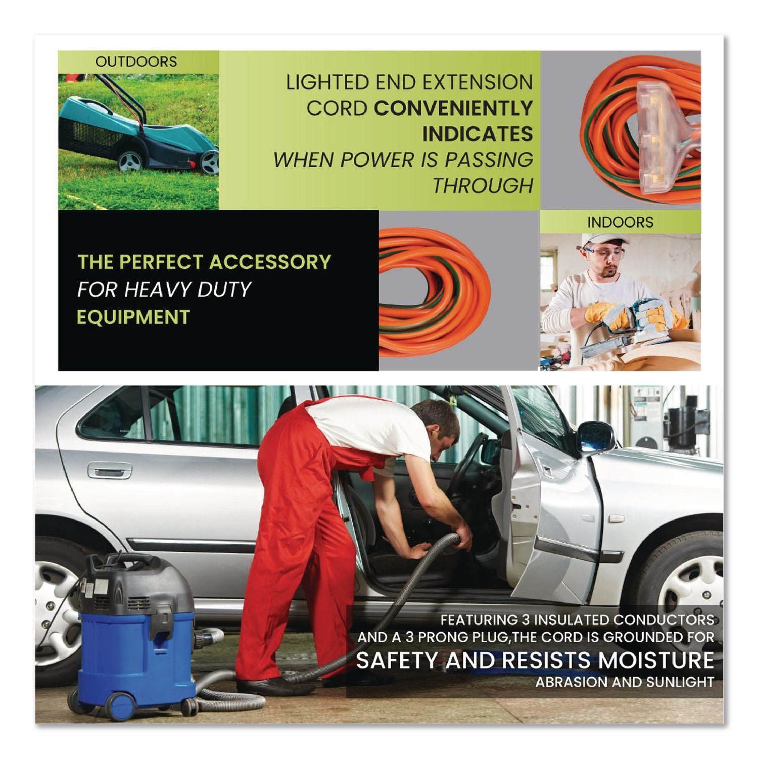 When the going gets tough, the tough get going, and the GoGreen Power lives up to that! The robust and durable, contractor grade 14/3 SJTW three-outlet extension cord is ready to rumble, both indoors as well as outdoors. Being moisture resistant, abrasion resistant and durable, even with prolonged exposure to sunlight, this cord is cETL listed and certified, which is compliant with the rigorous standards for a hard service thermoplastic cable rated for 125 volts. Our heavy-duty extension cord has molded plugs which gives it a sturdy build and make it easy to use. And what could be more convenient than merely seeing if the cord is working or not, since this item has a lighted end to show the power is on. The kink-free cord is recommended for use with heavy-duty equipment and tools. We offer free recycling and free shipping back of the used product to our recycling facility. Please view the recycling code and instructions on the back of the package and visit the GoGreen Power website for additional information.