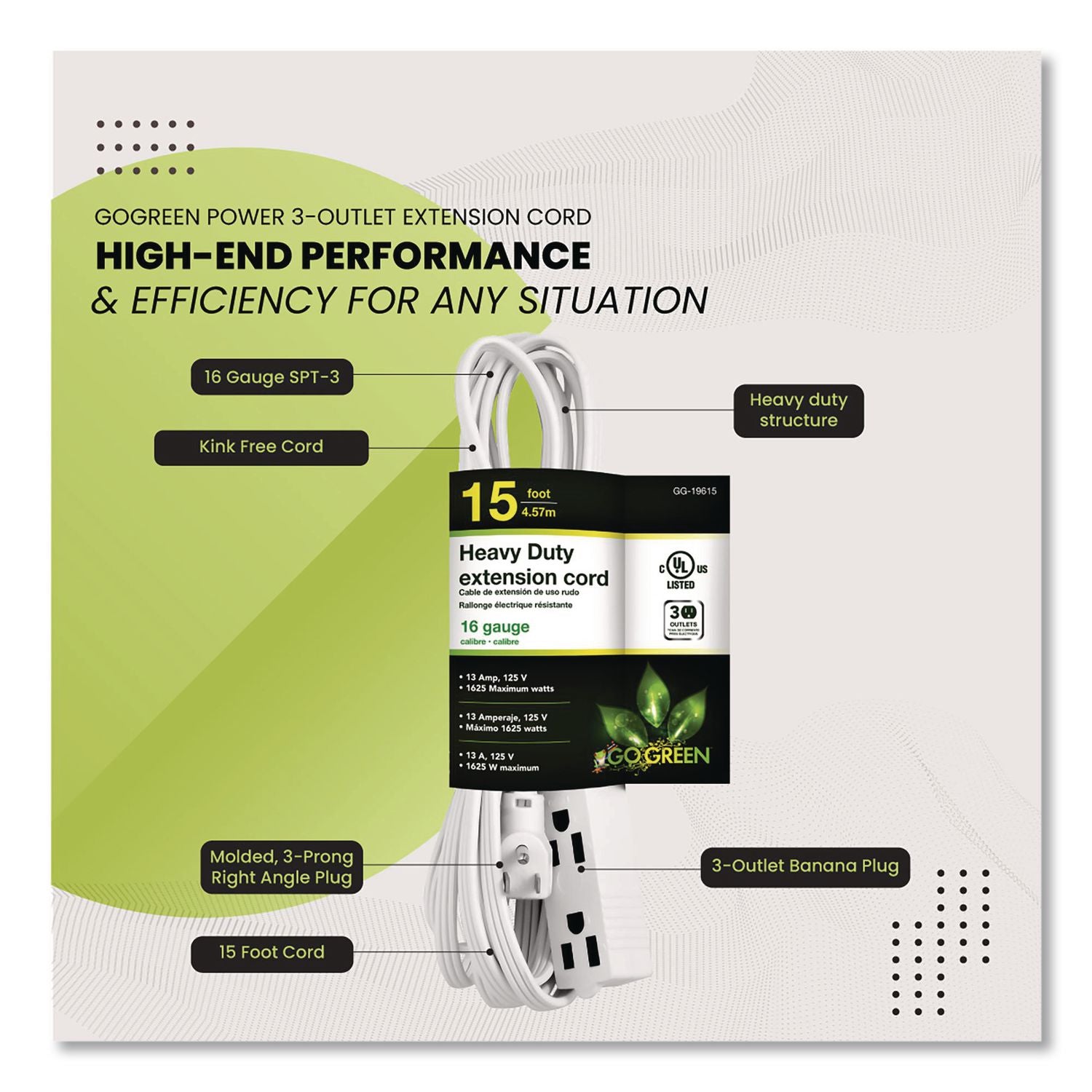 GoGreen Power 3 Outlet Indoor Extension Cord, 15 ft, 13 A, White (GGPGG19615)