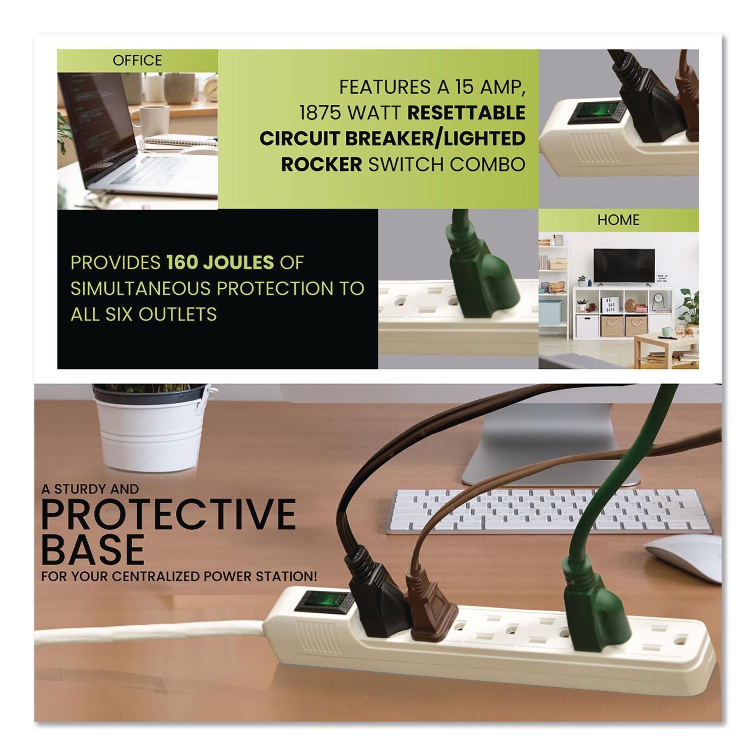 The GoGreen Power 6 Outlet Mini Surge Protector is the solution to the situations where you need something a bit more heavy-duty to protect your electrical appliances. When the going gets tough, the tough get going, and this power outlet surge protector lives up to the saying! Our surge strip comes with a 15 A, 1,875 W resettable circuit breaker/rocker switch combo, that protects your unit in case of a surge spike. This safety feature helps protect various electrical appliances such as televisions, computers, laptops and much more! Also built into the circuit breaker/rocker switch is an indicator light that confirms operation for the unit. Our mini surge protector provides 90 J of simultaneous protection against electrical power surges for its six adapters, all at once, making it ideal for almost any indoor electrical appliances. Hook up your charger, television, laptop or use it to power your desktop at the office! The possibilities are endless with this surge protector. The hard usage 2 ft service cord attached to the surge protector is constructed of 14-gauge SJT cable housed in a durable PVC insulation and jacket that makes this heavy-duty cord strong enough to last a lifetime but pliable enough to be fully extended. The unit also offers a sturdy base for your centralized power station by simply attaching your unit where you need it most. The included keyhole slots on the back of the surge protector make it a breeze to mount your unit to a wall, desk, workbench or counter. We offer free recycling and free shipping back of the used product to our recycling facility. Please view the recycling code and instructions on the back of the package and visit the GoGreen Power website for additional information.