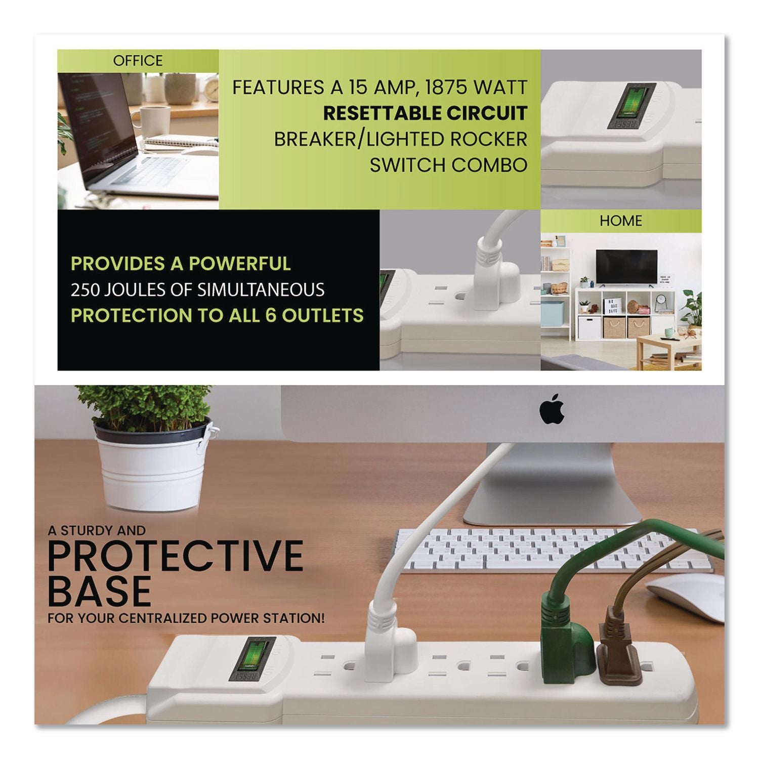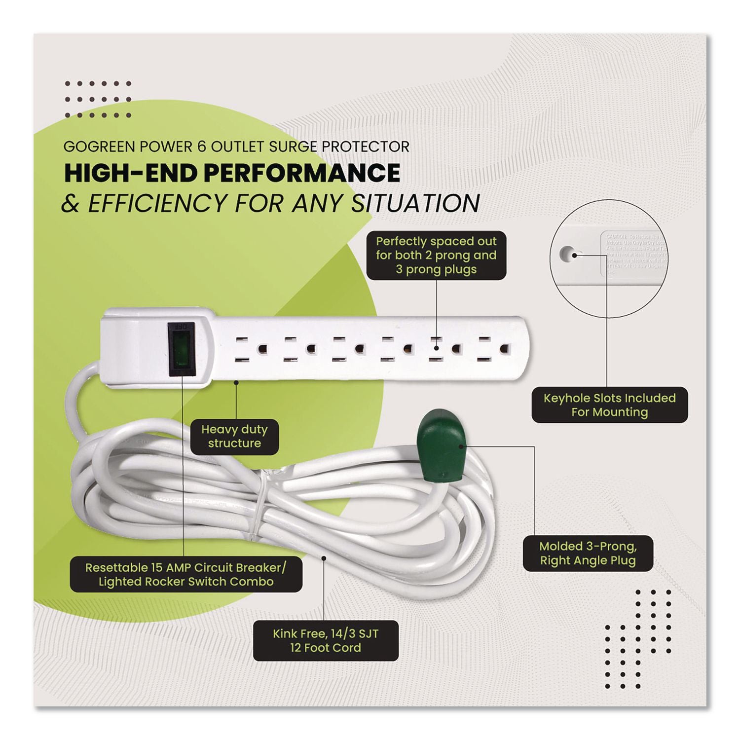 The GoGreen Power 6 Outlet Surge Protector is the solution to the situations where you need something a bit more heavy to protect your electrical appliances. When the going gets tough, the tough get going, and this six outlet surge protector lives up to the saying! The surge strip comes with a robust 15 A, 1,875 W resettable circuit breaker/rocker switch combo, that protects your unit in case of a surge spike. This safety feature helps protect various electrical appliances such as televisions, computers, laptops and much more! Also built into the circuit breaker/rocker switch is an indicator light that confirms operation for the unit. Our six outlet surge protector provides plenty of protection against electrical power surges for its six adaptors, all at once, making it ideal for almost any indoor electrical appliances. Hook up your charger, television, charge your laptop, or use it to power your desktop at the office! The possibilities are endless with this surge protector. The hard usage cord attached to the surge protector is constructed of 14-gauge SJT cable housed in a durable PVC insulation and jacket that makes this heavy-duty cord strong enough to last a lifetime but pliable enough to be fully extended. The unit also offers a sturdy base for your centralized power station by simply attaching your unit where you need it most. The included keyhole slots on the back of the surge protector make it a breeze to mount your unit to a wall, desk, workbench or counter. We offer free recycling and free shipping back of the used product to our recycling facility. Please view the recycling code and instructions on the back of the package and visit the GoGreen Power website for additional information.