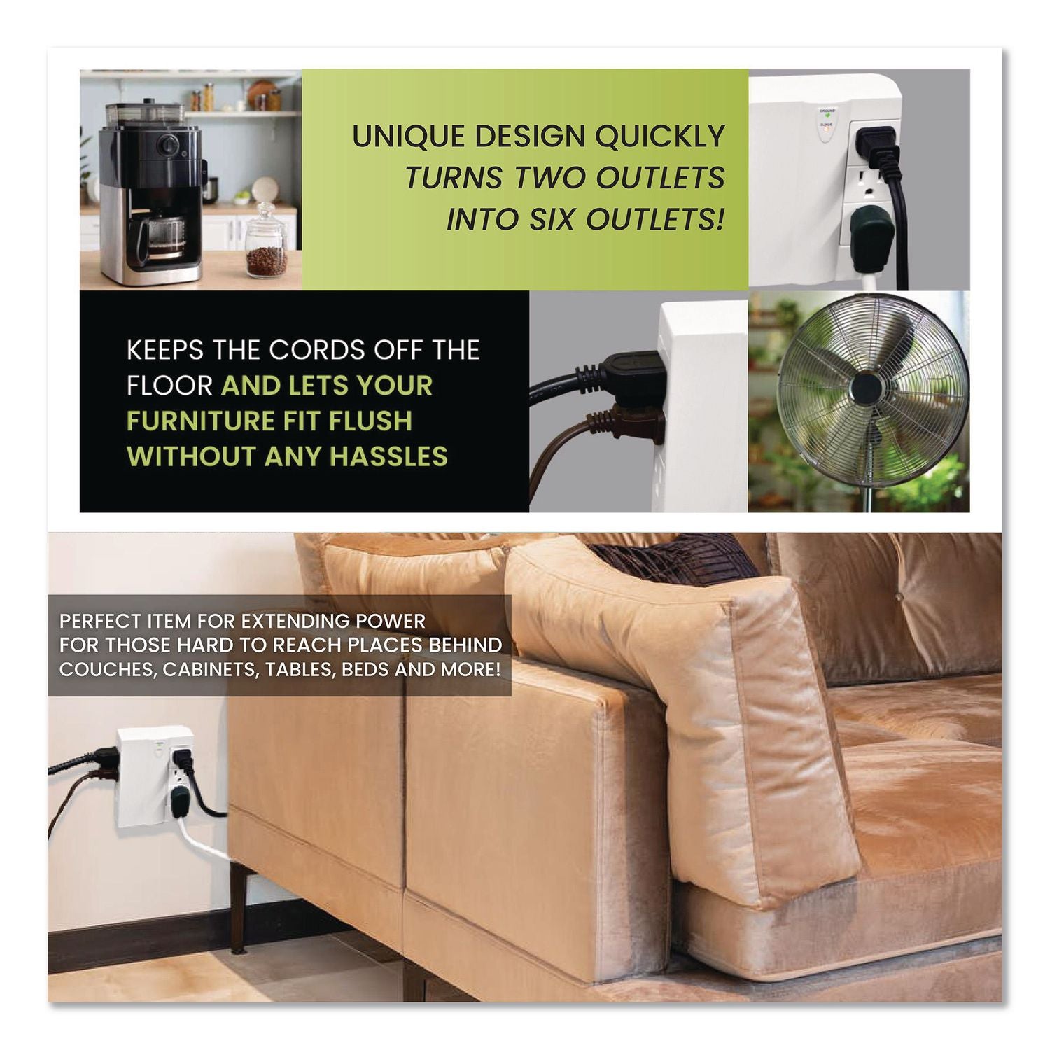 The GoGreen Power Swivel Wall Tap features six outlets conveniently designed to fit behind furniture and appliances. Excellent for use as a charging station, and perfect for use with larger electronics such as computers, printers, smartphones, tablets and theater systems. Look no further than the six-outlet wall tap adapter for all your home electrical needs! It's unique swiveling design can quickly turn two outlets into six outlets, of which three outlets swivel, and other three outlets are stationary. Each outlet fits a three-pronged, polarized plug securely. The wall tap power adapter is rated at 1,875 W and can be used with polarized plugs. It also offers a maximum surge protection of 1,000 J! Our wall tap unit is extremely versatile and can be plugged into any three-prong duplex outlet. Its reinforced plastic structure ensures that the wall tap is there with you for the long haul. cUL listed and meets all industry standards. Rated for a maximum of 125 V. We offer free recycling and free shipping back of the used product to our recycling facility. Please view the recycling code and instructions on the back of the package and visit the GoGreen Power website for additional information.