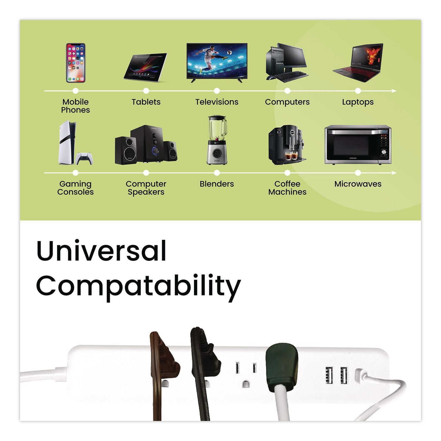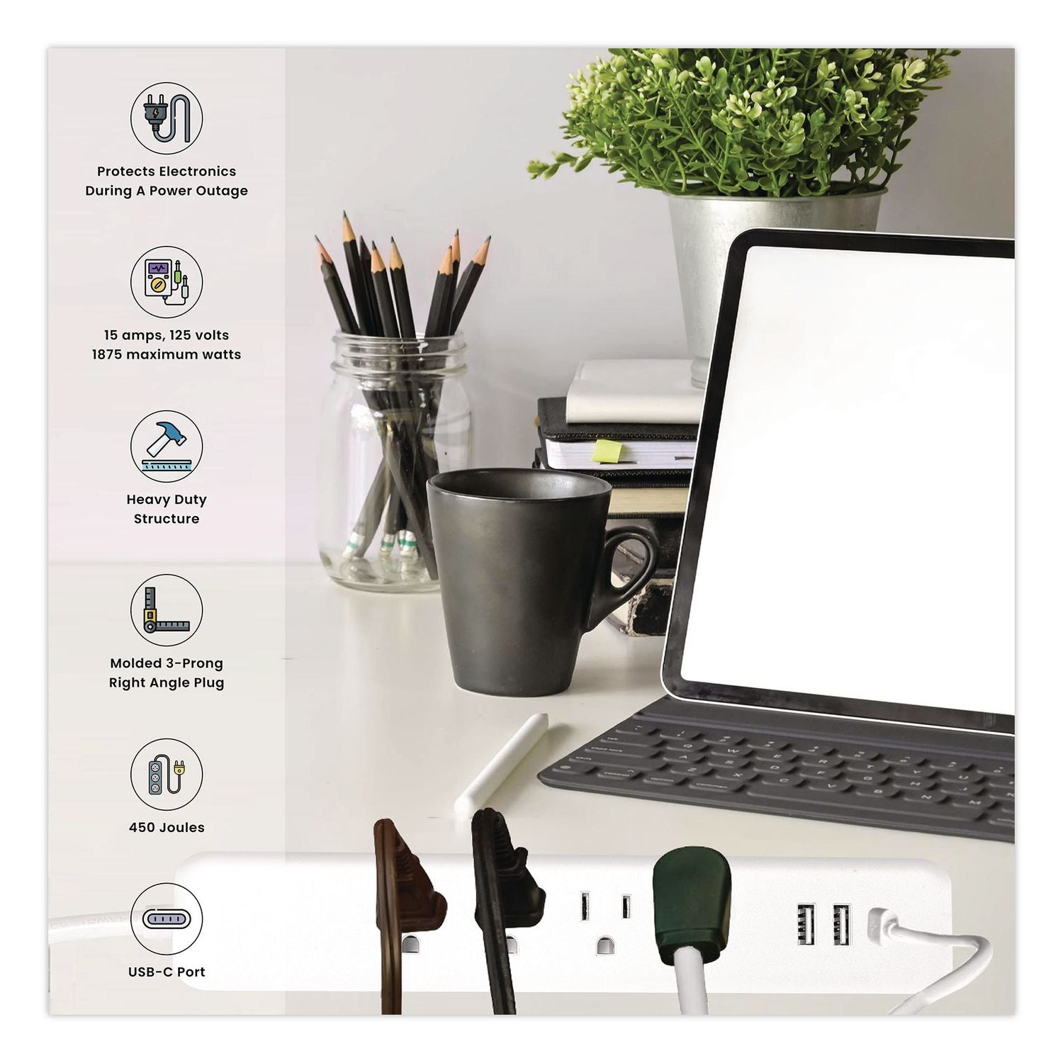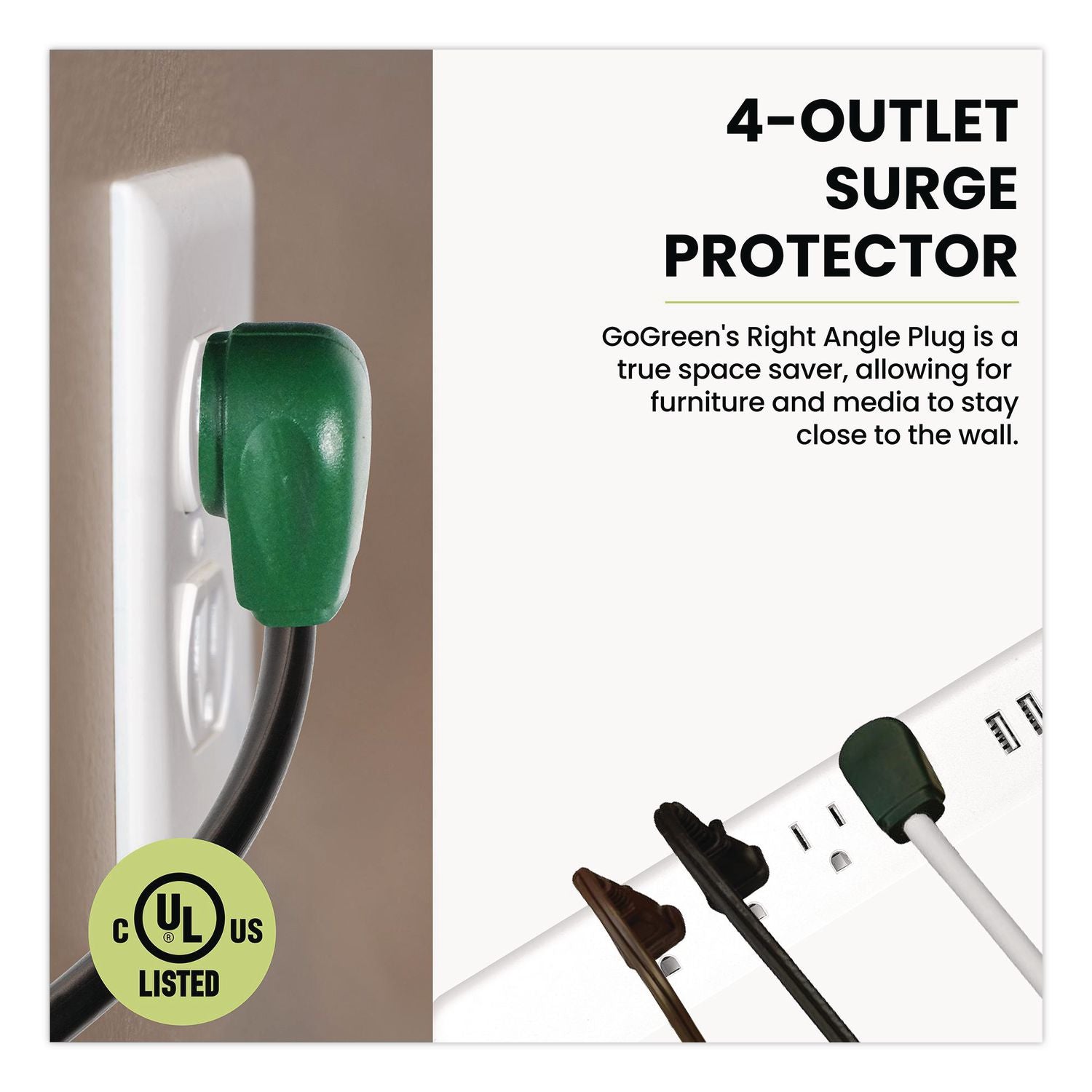 Introducing the ultimate in power and protection for your electronic devices, the GoGreen Power Four-Outlet Surge Protector with USB Ports. Ensure your valuable electronics are safe from power surges with our robust surge protector featuring 450 Joules of surge protection and a 15 A circuit breaker. The indicator light provides peace of mind by confirming operation at a glance. Designed for convenience and efficiency, this surge protector includes four outlets to accommodate all your devices and a four-foot power cord for extended reach. The right angle plug is a space-saving feature, perfect for tight spaces and behind furniture. Never run out of charging options with two USB-A ports and one USB-C port, delivering a total of 3.4 A of power. Charge smartphones, tablets and other USB devices directly from the surge protector while keeping your outlets free for other electronics. Ideal for home, office or travel, the GoGreen Power Surge Protector combines safety, versatility, and modern design. Protect your devices and simplify your charging setup with one convenient device.