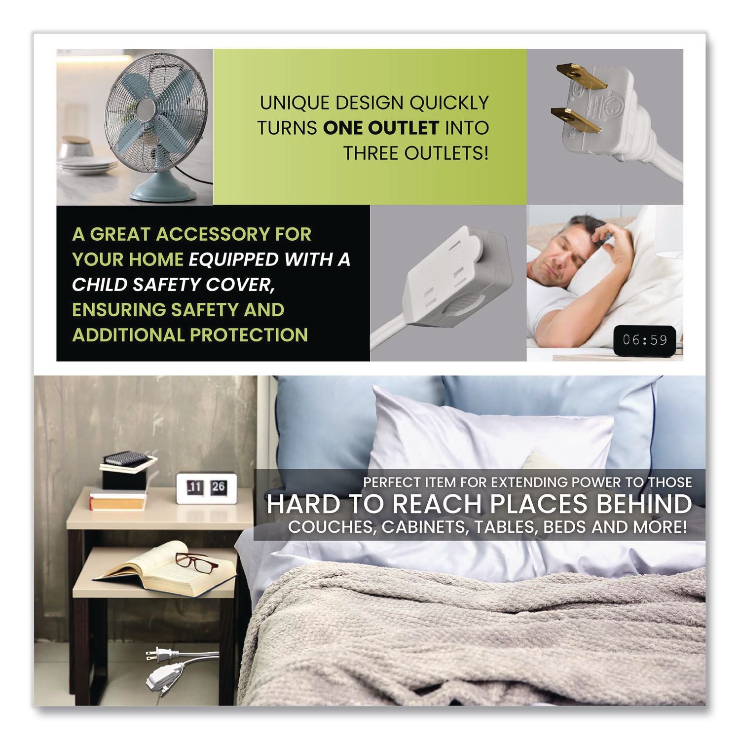 GoGreen Power two-prong extension cord comes equipped with three outlets and is rated for indoor use only. Each extension cord is fixed with a child safety cover for extra protection. The 16 gauge kink-free cord is safe and reliable, providing superb insulation. It can be plugged into a standard three-prong 120 V AC outlet. The heavy-duty molded plugs ensure a snug and secure fit and avoid detachment from the wire. Perfect for daily use, this 16/2 SPT-2 cord is cETL certified and meets all industry standards. The indoor extension cord is rated for a maximum of 13 A, 1,625 W, 125 V. Perfect for devices such as lamps, phone chargers, fans, heaters and many other electronics. We offer free recycling and free shipping back of the used product to our recycling facility. Please view the recycling code and instructions on the back of the package and visit the GoGreen Power website for additional information.