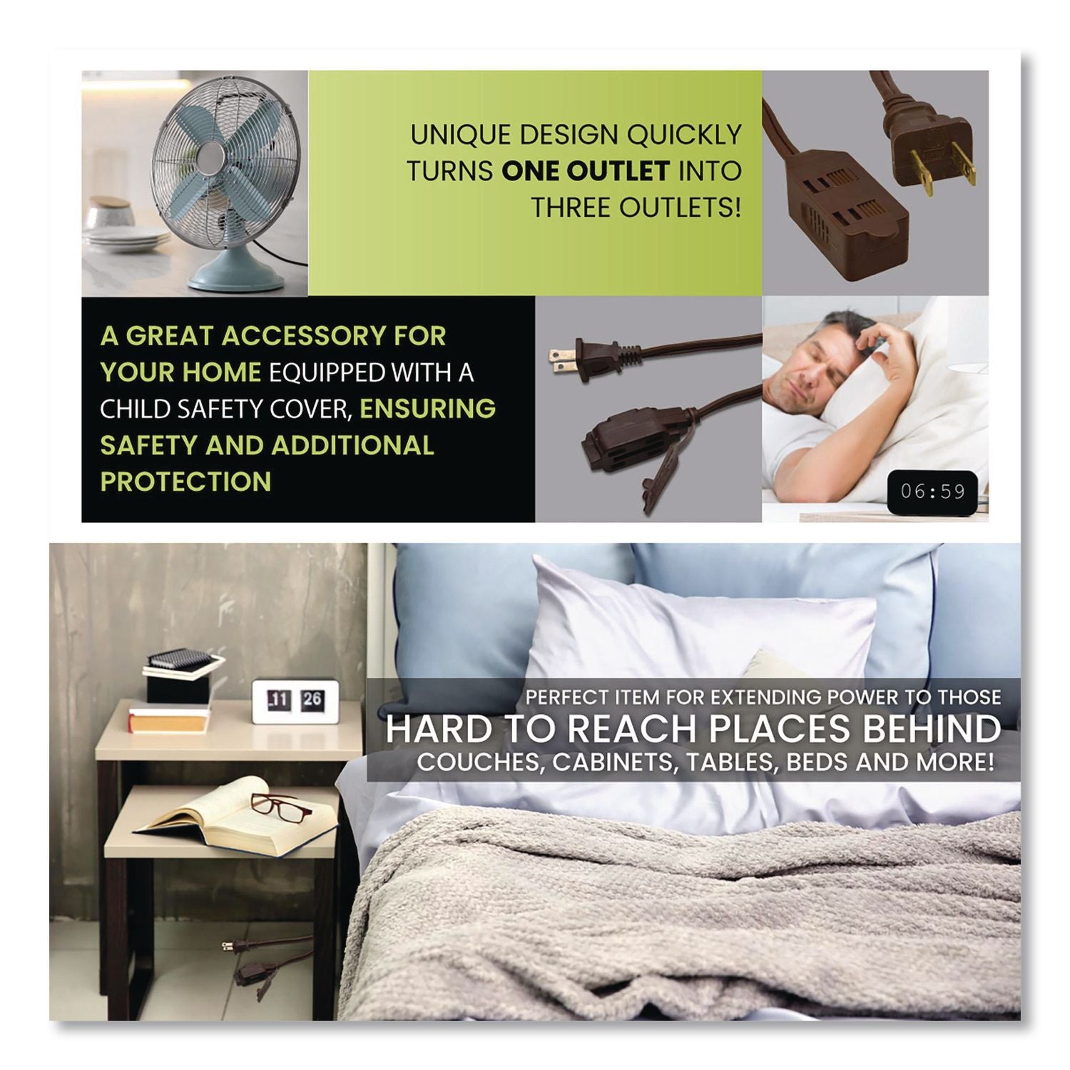 GoGreen Power two-prong extension cord comes equipped with three outlets and is rated for indoor use only. Each extension cord is fixed with a child safety cover for extra protection. The 16 gauge kink-free cord is safe and reliable, providing superb insulation. It can be plugged into a standard three-prong 120 V AC outlet. The heavy-duty molded plugs ensure a snug and secure fit and avoid detachment from the wire. Perfect for daily use, this 16/2 SPT-2 cord is cETL certified and meets all industry standards. The indoor extension cord is rated for a maximum of 13 A, 1,625 W, 125 V. Perfect for devices such as lamps, phone chargers, fans, heaters and many other electronics. We offer free recycling and free shipping back of the used product to our recycling facility. Please view the recycling code and instructions on the back of the package and visit the GoGreen Power website for additional information.