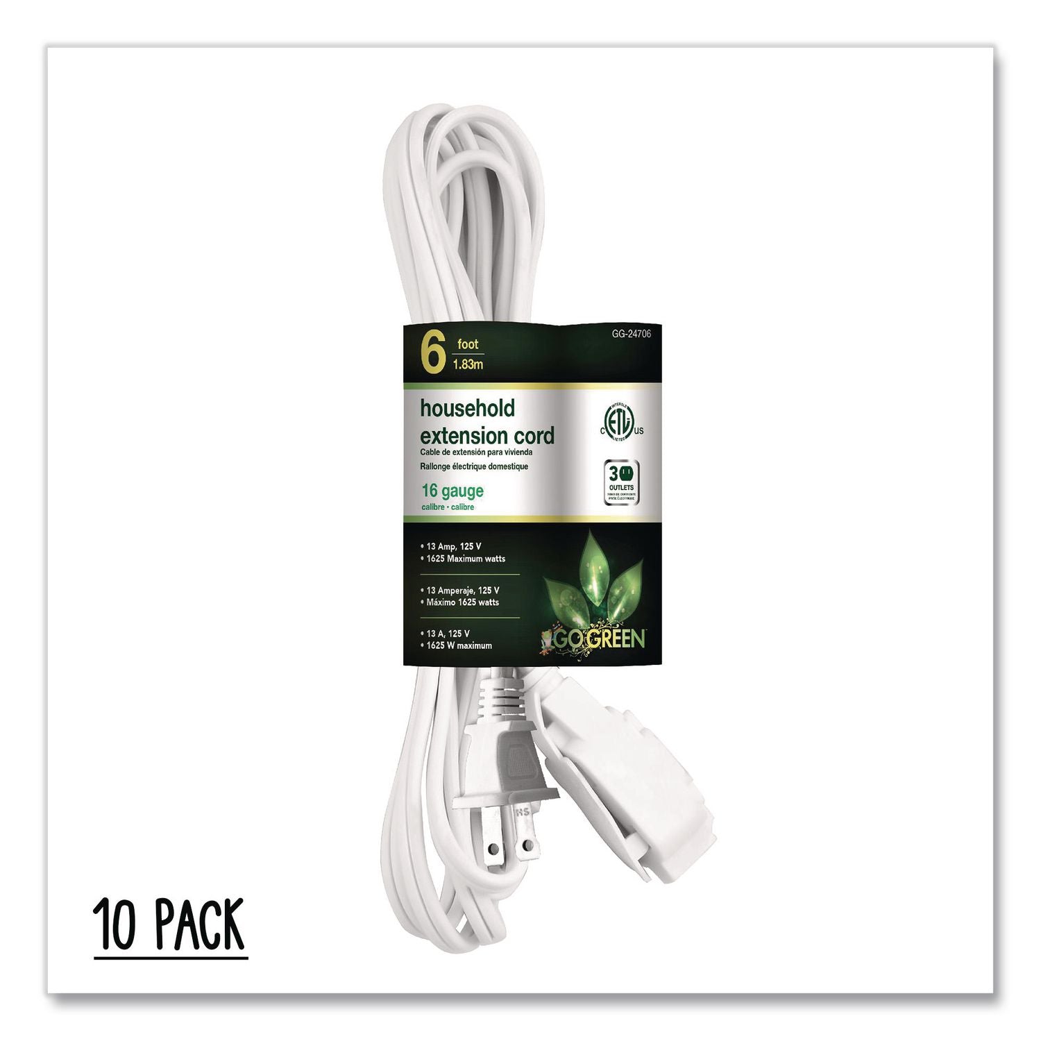 GoGreen Power Household Extension Cord, 6 ft, 13 A, White 10/Pack (GGPGG2470610)