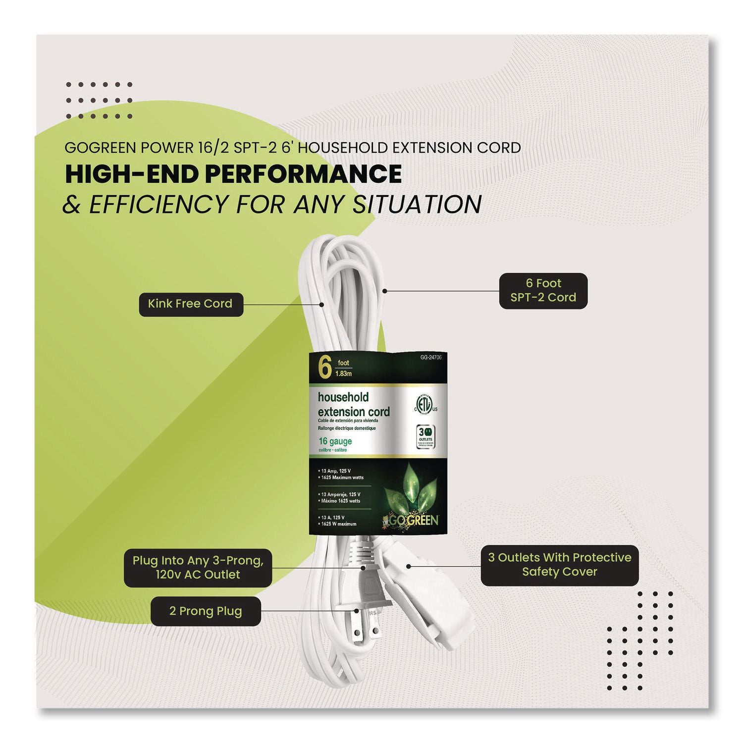 GoGreen Power two-prong extension cord comes equipped with three outlets and is rated for indoor use only. Each extension cord is fixed with a child safety cover for extra protection. The 16 gauge kink-free cord is safe and reliable, providing superb insulation. It can be plugged into a standard three-prong 120 V AC outlet. The heavy-duty molded plugs ensure a snug and secure fit and avoid detachment from the wire. Perfect for daily use, this 16/2 SPT-2 cord is cETL certified and meets all industry standards. The indoor extension cord is rated for a maximum of 13 A, 1,625 W, 125 V. Perfect for devices such as lamps, phone chargers, fans, heaters and many other electronics. We offer free recycling and free shipping back of the used product to our recycling facility. Please view the recycling code and instructions on the back of the package and visit the GoGreen Power website for additional information.