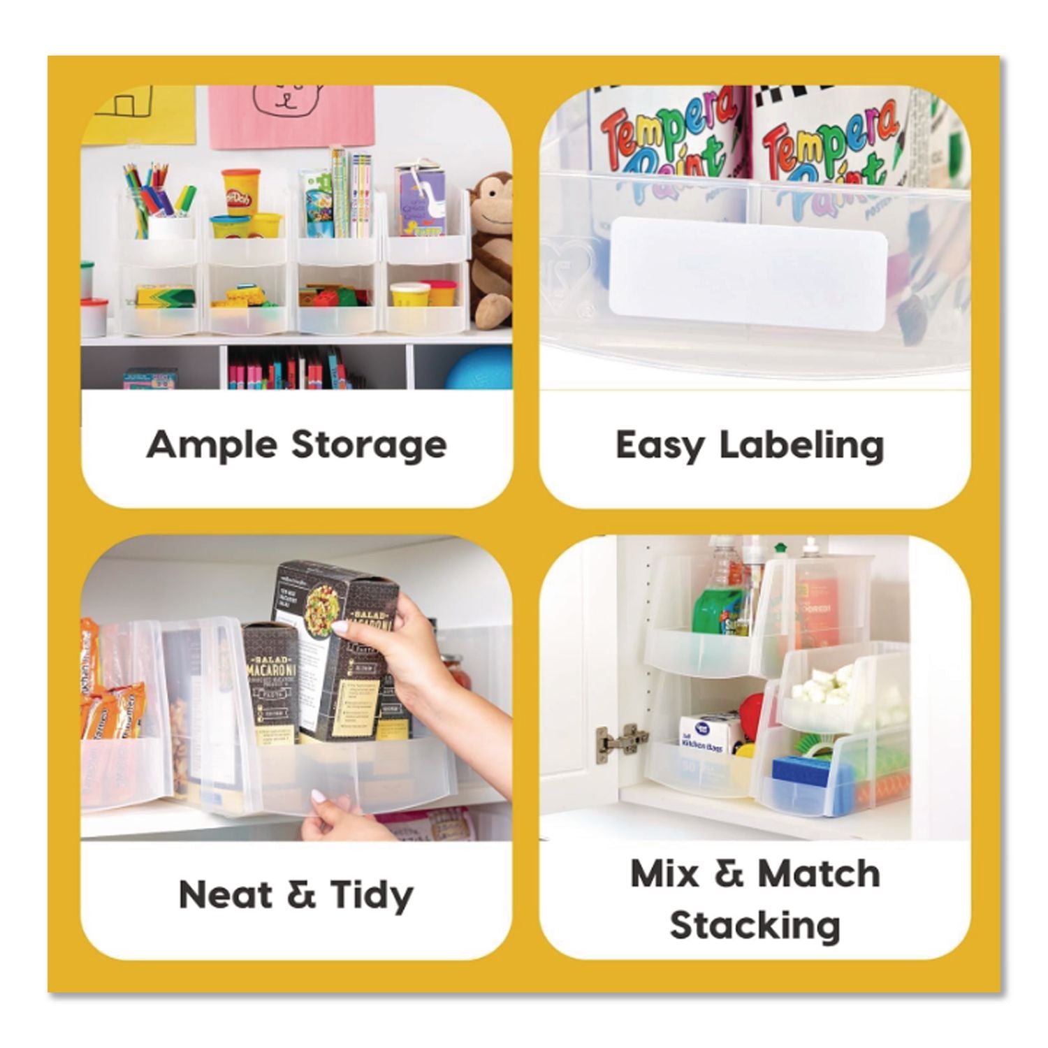 Transport items without difficulty by using this modular stacking bin. With clear plastic material, this stacking bin provides an easy way to see what's inside, and the container has a compact design, making it easy to take with you wherever you need to go. Delivers a convenient way to store staples, journals, folders, electronics and other small items.