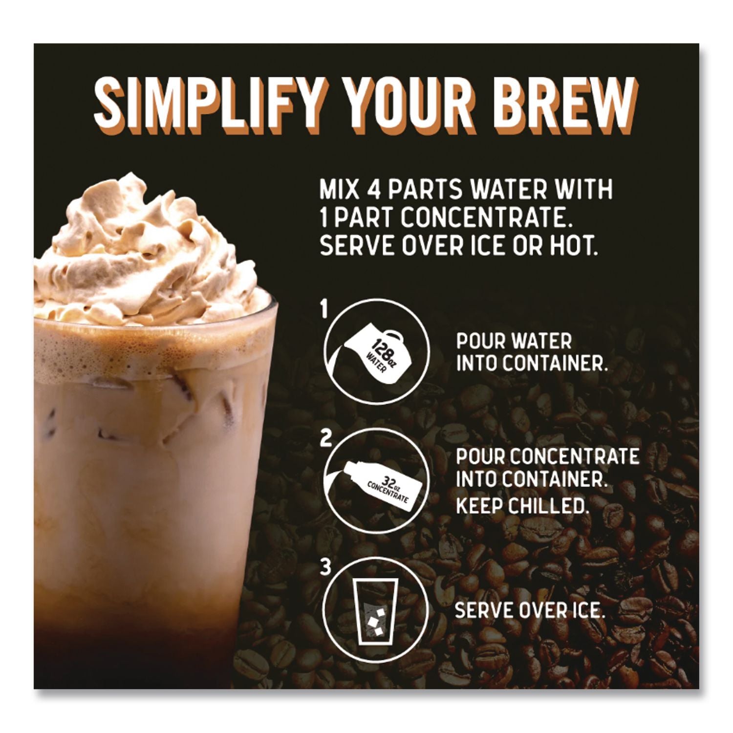This cold brew concentrate puts you in control. Use a little, use a lot: you decide. Get creative with your coffee or make it quick, black over ice. Prepare batches of any size. Mix one part concentrate with four parts water. Made with premium 100% arabica coffee beans and cold water in small batches steeped to high quality.
