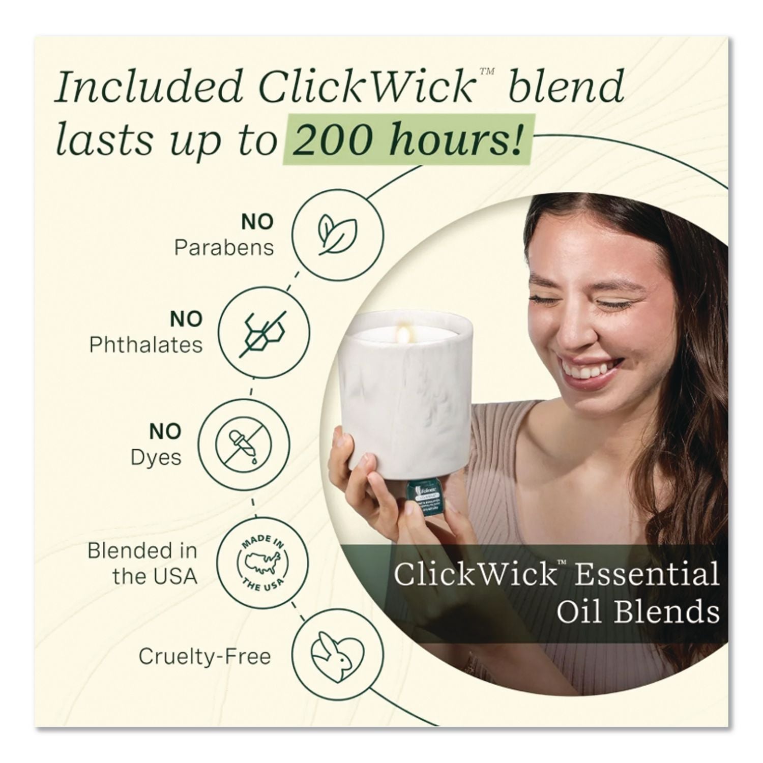 This innovative and patent-pending flameless candle diffuser features the ease and safety of a flameless candle, while also filling your space with beautiful aroma. Insert the included Clickwick™ Essential Oil Blend into the base of the candle, open the lid, and begin to unwind with relaxing mist, soothing scents, and a realistic flickering flame— all without worrying about fire, smoke, or spilled wax. And change scents anytime using any blend from our Clickwick™ family of scents. This flameless candle doesn't just look real – it acts real, too; Turn the candle off by "blowing" it out or snuff out the "flame" with the lid. Candle is rechargeable (charger included) and doesn't require water, so no mold to worry about or constant trips to the sink to refill. Perfect for any room in your house and particularly great for small or high-trafficked spaces like dorm rooms, apartments, and homes with young kids or pets.