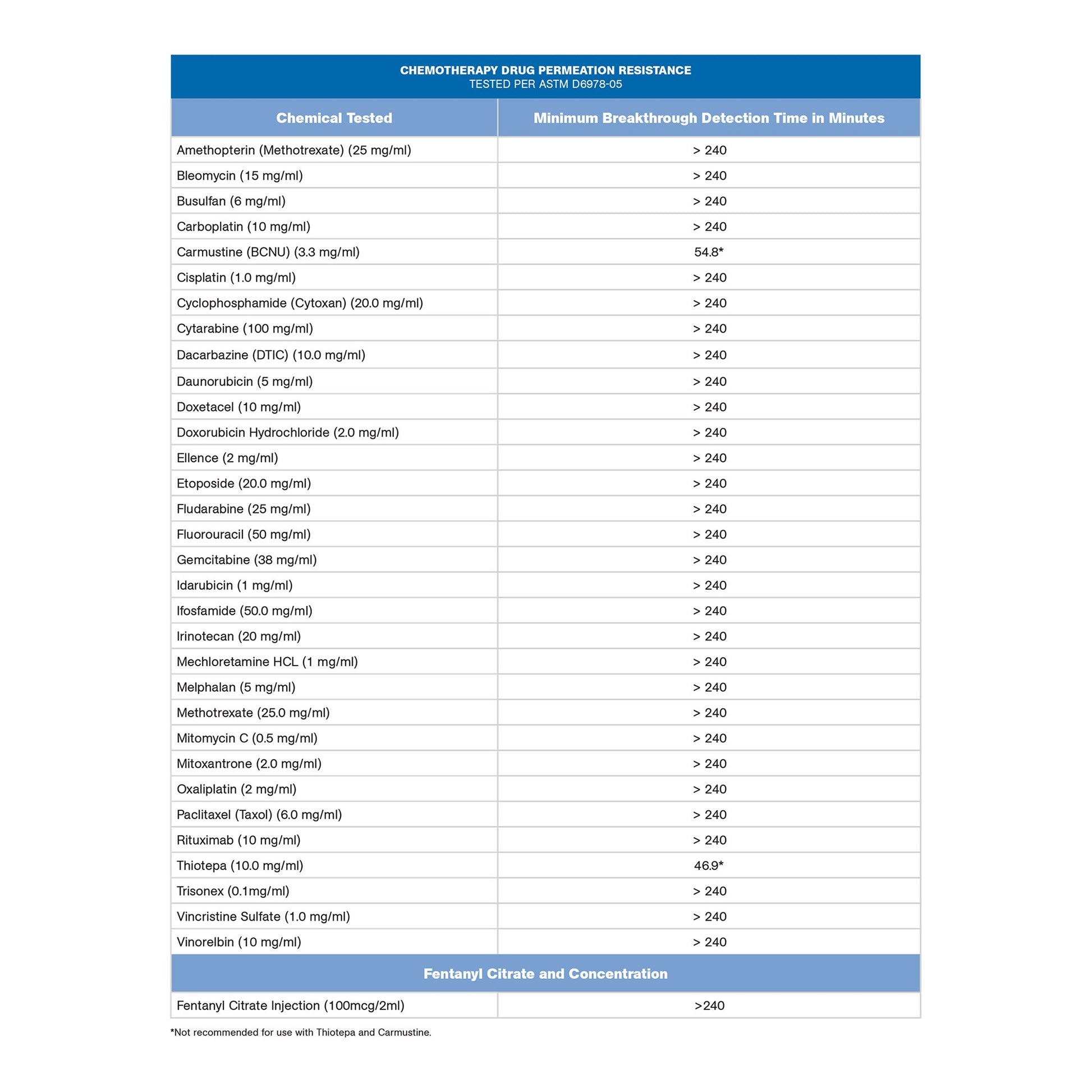 - Tested for use with 32 chemotherapy drugs; meets ASTM standards for resistance to permeation by chemotherapy drugs