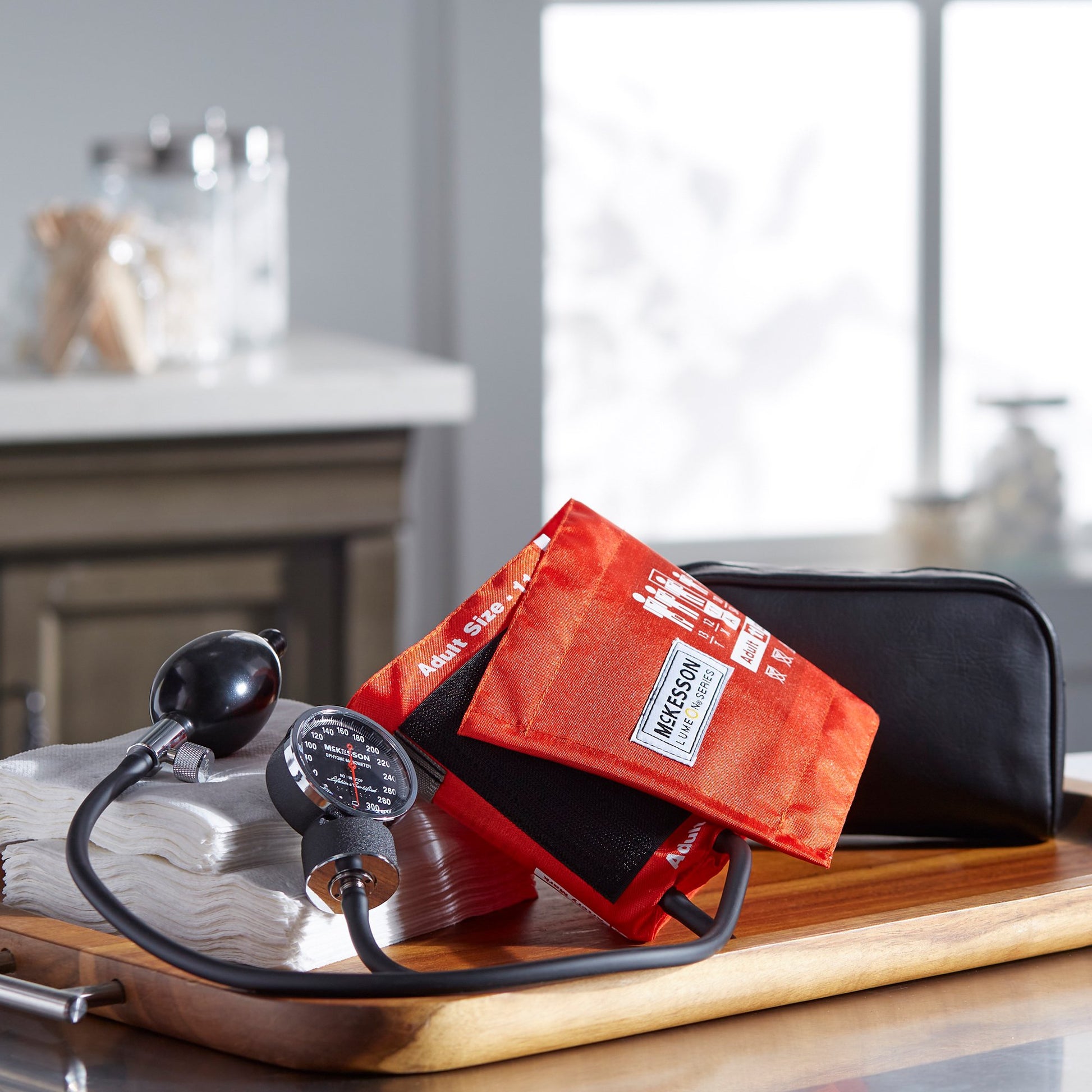 - The orange McKesson aneroid sphygmomanometer includes a leatherette case for convenient transport