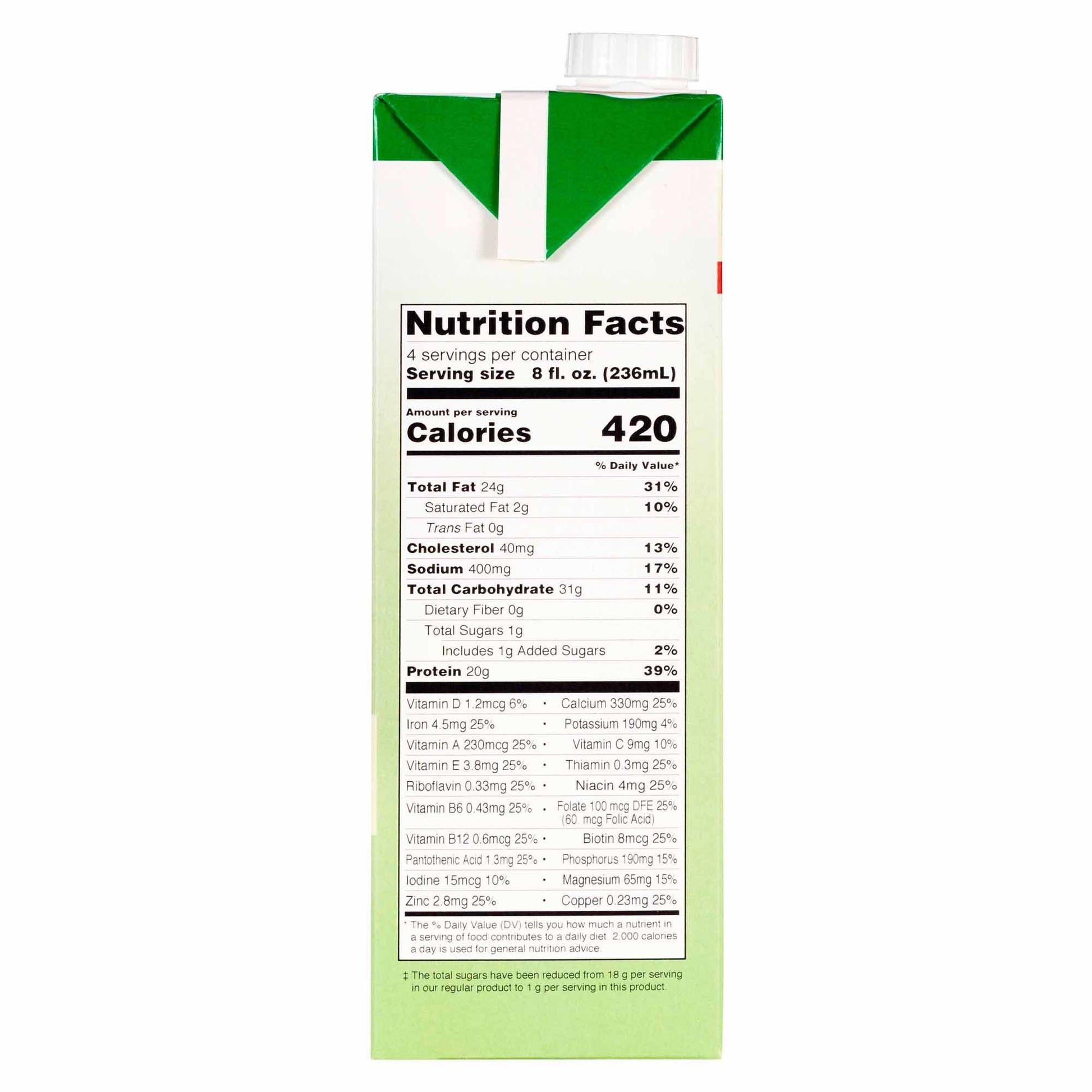 - In an 8-ounce serving size, extra nutrition includes 480 calories, 20 grams of protein and 18 vitamins and minerals
