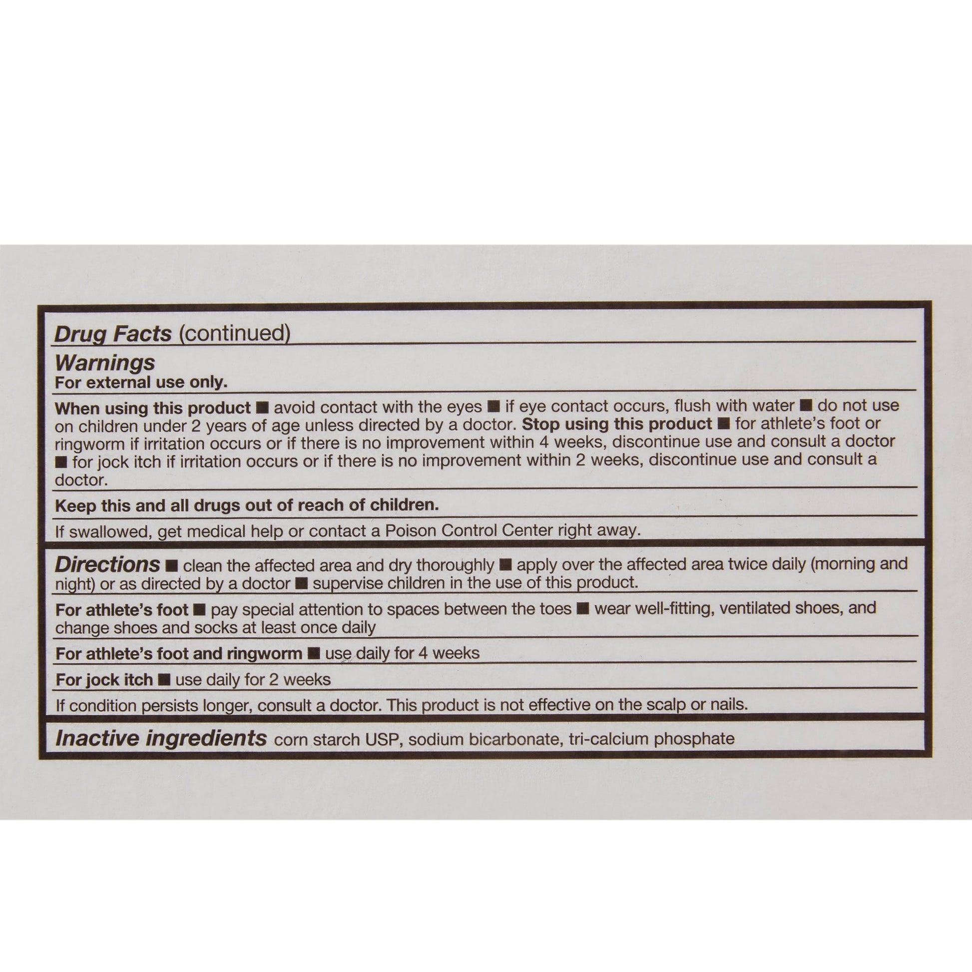 - Active Ingredients: Miconazole Nitrate / Corn Starch Base