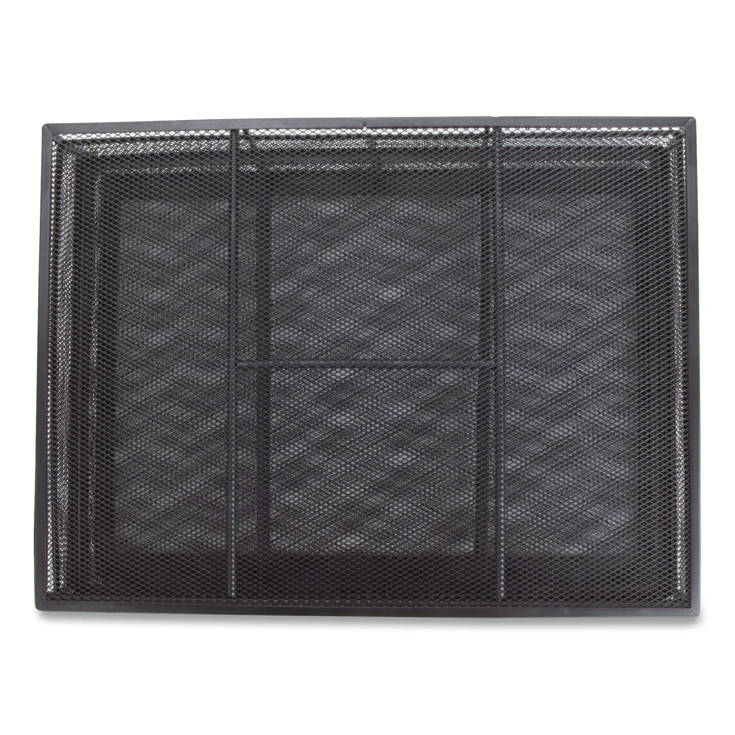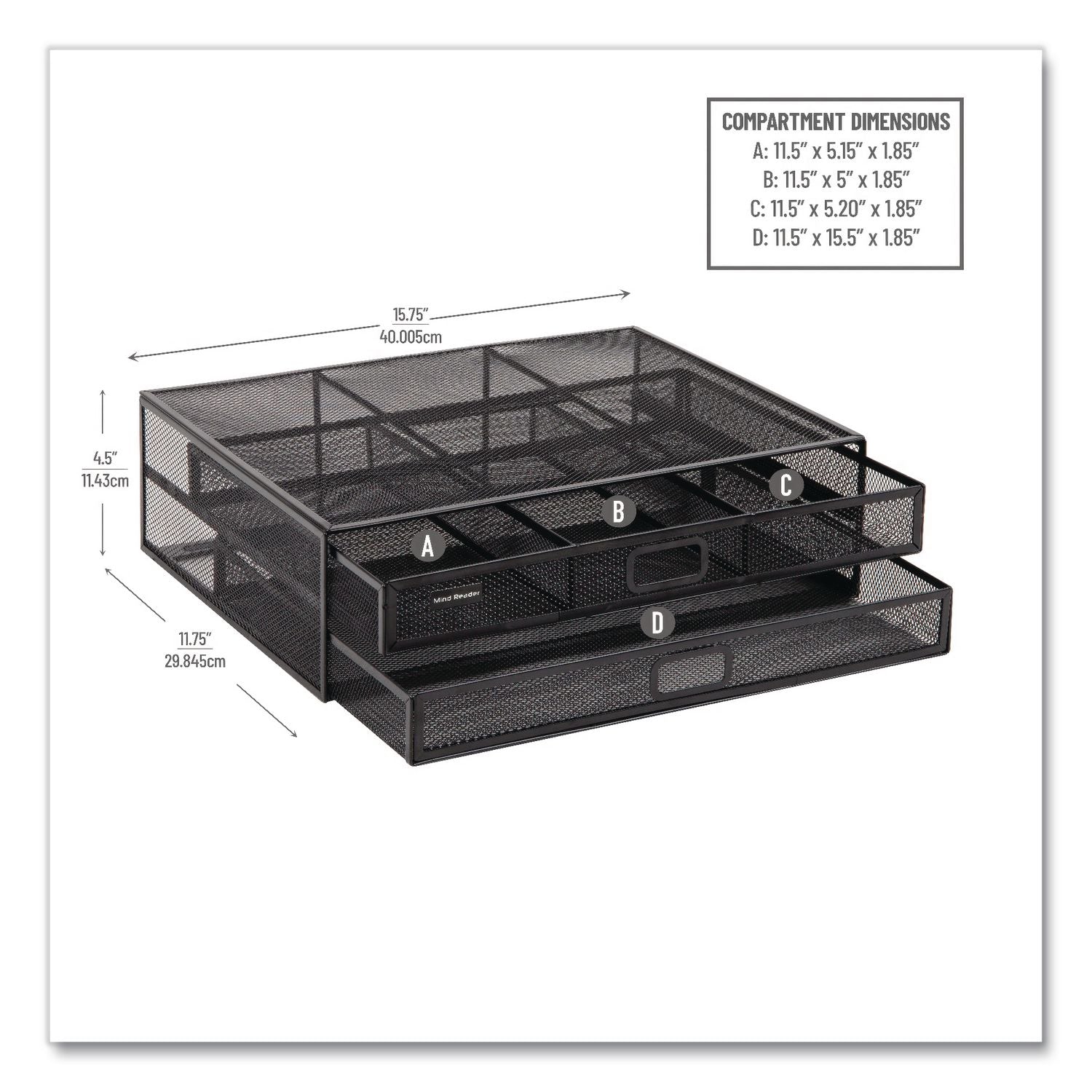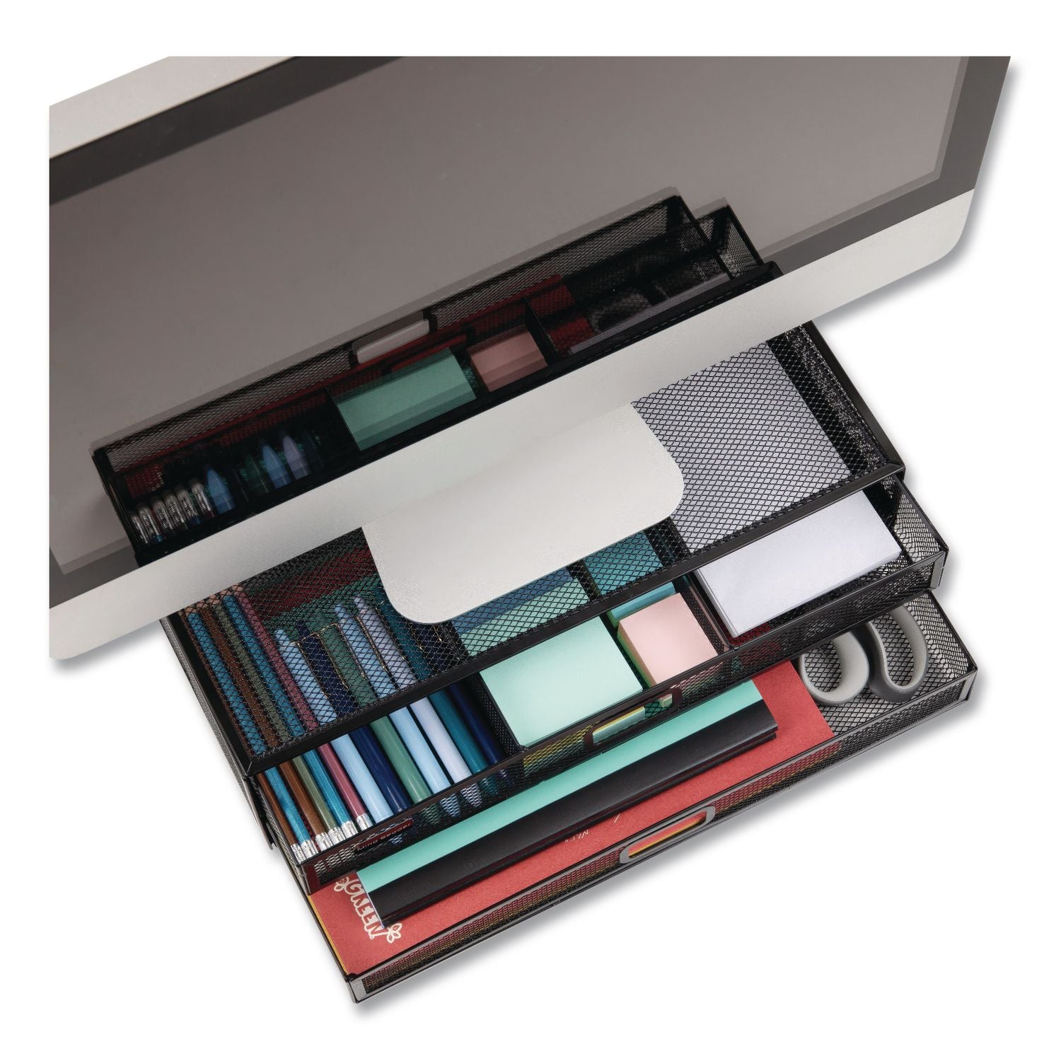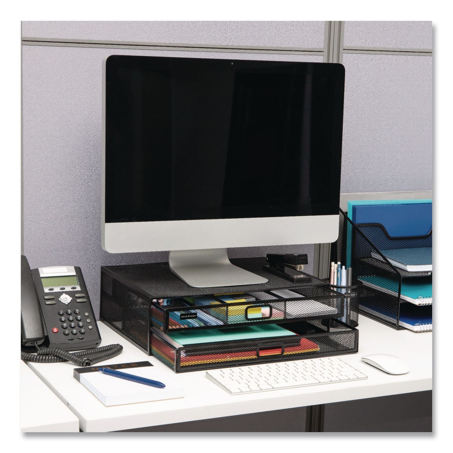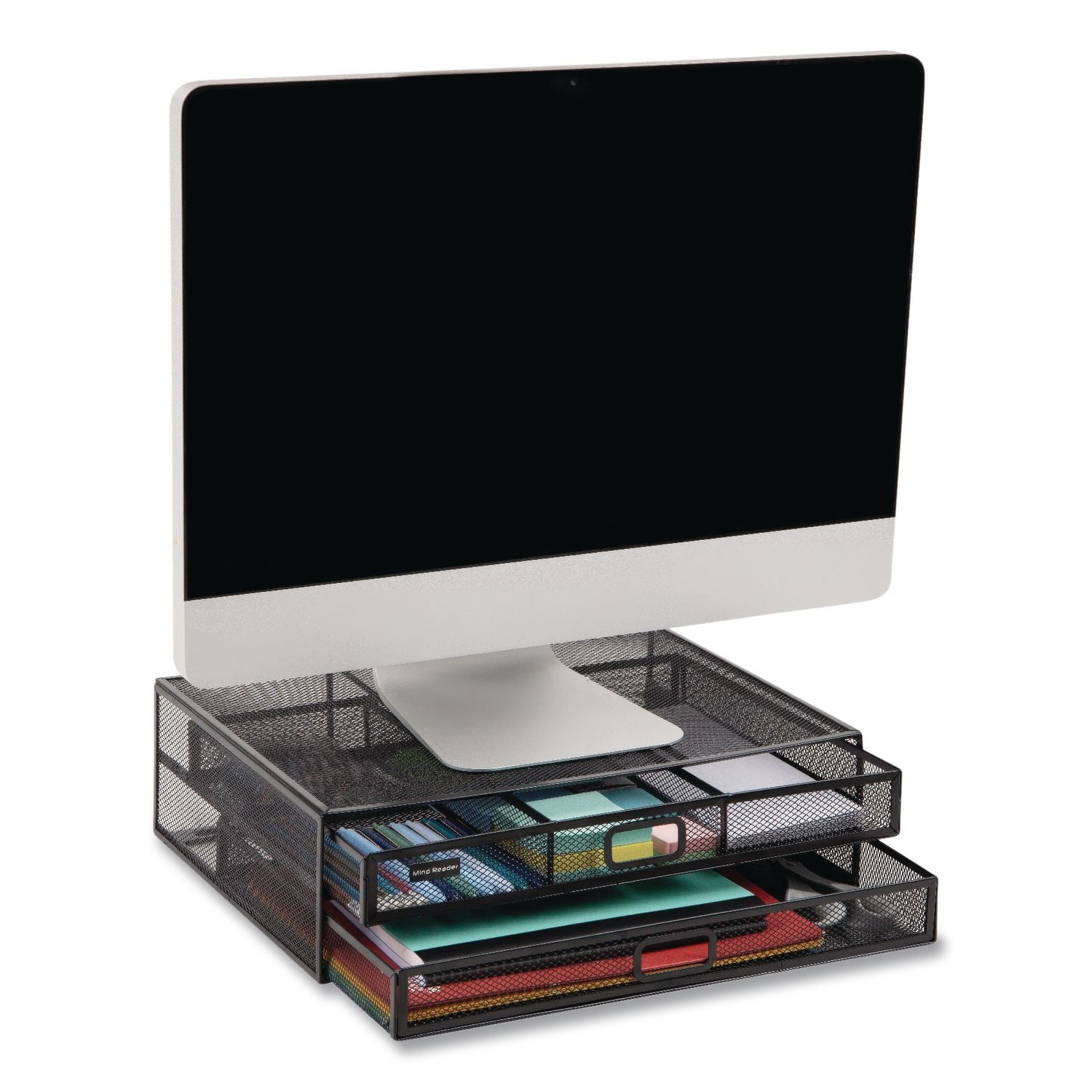 Enhance your workspace with this two-tier desktop organizer and monitor stand. It's perfect for securely supporting desktop electronics such as laptops, notebooks, monitors, printers and can even double as a TV stand. The organizer features a durable metal mesh construction that withstands daily use. Non-slip grips on the bottom of the stand keep it firmly in place, ensuring your items stay secure and stable. Weighing in at just 4.4 lbs, it's also extremely portable and can easily be moved to wherever you need it. Maximize your organization capabilities with two tiers of drawers. The top tier is ideal for storing files, folders and other important documents, while one of the pull-out drawers features three separate compartments for storing office essentials like pens, pencils and paper clips. The see-through design lets you quickly locate what you need. This desktop organizer is a great addition to your office setup and blends in perfectly with the rest of the Network Collection. It also makes an excellent gift for graduations, birthdays, holidays, and other special occasions. Boost your productivity and keep your space tidy with this versatile desktop organizer.