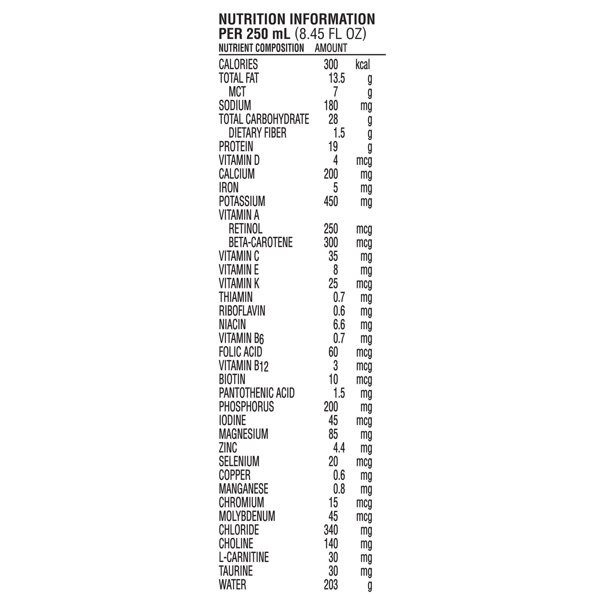 - Ingredients: WATER, MALTODEXTRIN, ENZYMATICALLY HYDROLYZED WHEY PROTEIN (MILK), MEDIUM CHAIN TRIGLYCERIDES, AND LESS THAN 2% OF CORNSTARCH, REFINED FISH OIL (ANCHOVY, SARDINE), SOYBEAN OIL, VITAMINS AND MINERALS, FRUCTOOLIGOSACCHARIDES, SOY LECITHIN, INULIN (FROM CHICORY), GUAR GUM, SALT, CITRIC ACID, VITAMINS AND MINERALS: MAGNESIUM CHLORIDE, CALCIUM PHOSPHATE, CHOLINE CHLORIDE, CALCIUM CITRATE, SODIUM ASCORBATE, SODIUM PHOSPHATE, MAGNESIUM OXIDE, TAURINE, L-CARNITINE, SODIUM CITRATE, POTASSIUM CHLORIDE, FERROUS SULFATE, ZINC SULFATE, DL-ALPHA TOCOPHERYL ACETATE, NIACINAMIDE, MANGANESE SULFATE, CALCIUM PANTOTHENATE, COPPER SULFATE, THIAMINE MONONITRATE, PYRIDOXINE HYDROCHLORIDE, RIBOFLAVIN, VITAMIN A PALMITATE, BETA-CAROTENE, FOLIC ACID, POTASSIUM IODIDE, CHROMIUM CHLORIDE, SODIUM SELENATE, SODIUM MOLYBDATE, VITAMIN K1, BIOTIN, VITAMIN D3, VITAMIN B12