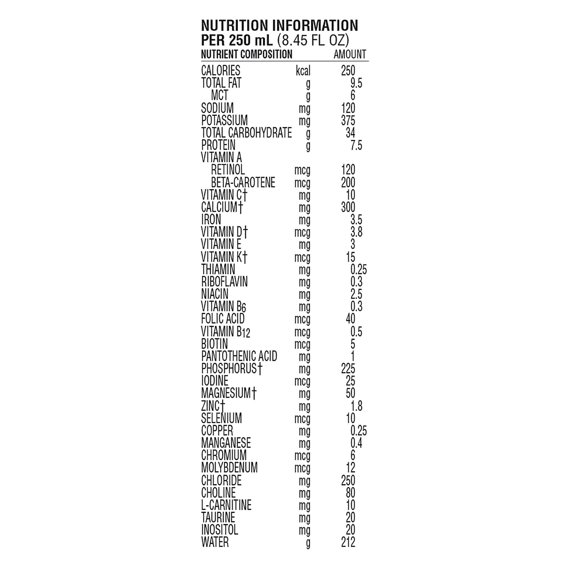 - Ingredients: WATER, MALTODEXTRIN, ENZYMATICALLY HYDROLYZED WHEY PROTEIN (MILK), MEDIUM CHAIN TRIGLYCERIDES, AND LESS THAN 2% OF CORNSTARCH, VITAMINS AND MINERALS‡, SOYBEAN OIL, CANOLA OIL, SOY LECITHIN, GUAR GUM, SALT, VITAMINS AND MINERALS: CALCIUM PHOSPHATE, MAGNESIUM CHLORIDE, POTASSIUM CHLORIDE, SODIUM PHOSPHATE, POTASSIUM CITRATE, POTASSIUM PHOSPHATE, CHOLINE CHLORIDE, CALCIUM CITRATE, SODIUM ASCORBATE, TAURINE, MAGNESIUM OXIDE, L-CARNITINE, INOSITOL, FERROUS SULFATE, SODIUM CITRATE, ZINC SULFATE, DL-ALPHA TOCOPHERYL ACETATE, NIACINAMIDE, CALCIUM PANTOTHENATE, MANGANESE SULFATE, COPPER SULFATE, PYRIDOXINE HYDROCHLORIDE, RIBOFLAVIN, THIAMINE MONONITRATE, VITAMIN A PALMITATE, BETA-CAROTENE, FOLIC ACID, POTASSIUM IODIDE, SODIUM SELENATE, CHROMIUM CHLORIDE, VITAMIN K1, BIOTIN, VITAMIN D3, VITAMIN B12