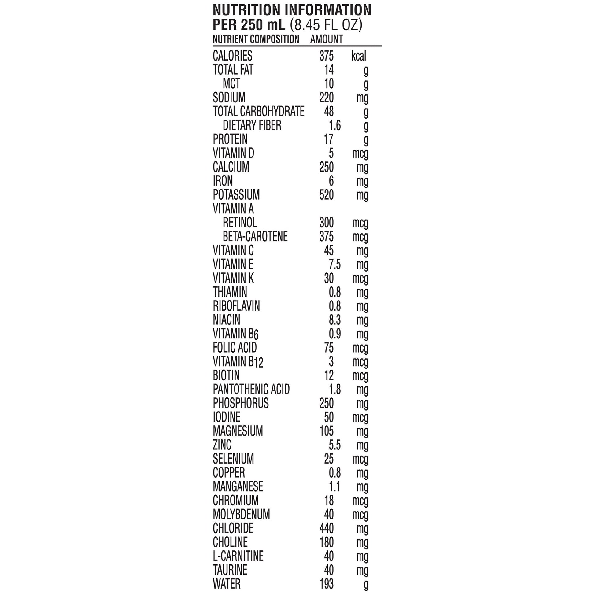 - Ingredients: Water, Maltodextrin, Enzymatically Hydrolyzed Whey Protein (Milk), Medium Chain Triglycerides, Sugar, and Less than 2% of Cornstarch, Soybean Oil, Vitamins and Minerals‡, Inulin (from Chicory), Fructooligosaccharides, Soy Lecithin, Guar Gum, Natural and Artificial Flavor, Salt, Sucralose. ‡Vitamins and Minerals:Magnesium Chloride, Sodium Phosphate, Calcium Phosphate, Calcium Citrate, Choline Chloride, Potassium Chloride, Sodium Ascorbate, Sodium Citrate, L-Carnitine, Taurine, Magnesium Oxide, Ferrous Sulfate, Zinc Sulfate, DL-Alpha Tocopheryl Acetate, Niacinamide, Manganese Sulfate, Calcium Pantothenate, Copper Sulfate, Potassium Citrate, Thiamine Mononitrate, Pyridoxine Hydrochloride, Riboflavin, Vitamin A Palmitate, Beta-Carotene, Folic Acid, Potassium Iodide, Chromium Chloride, Sodium Selenate, Sodium Molybdate, Vitamin K1, Biotin, Vitamin D3, Vitamin B12.