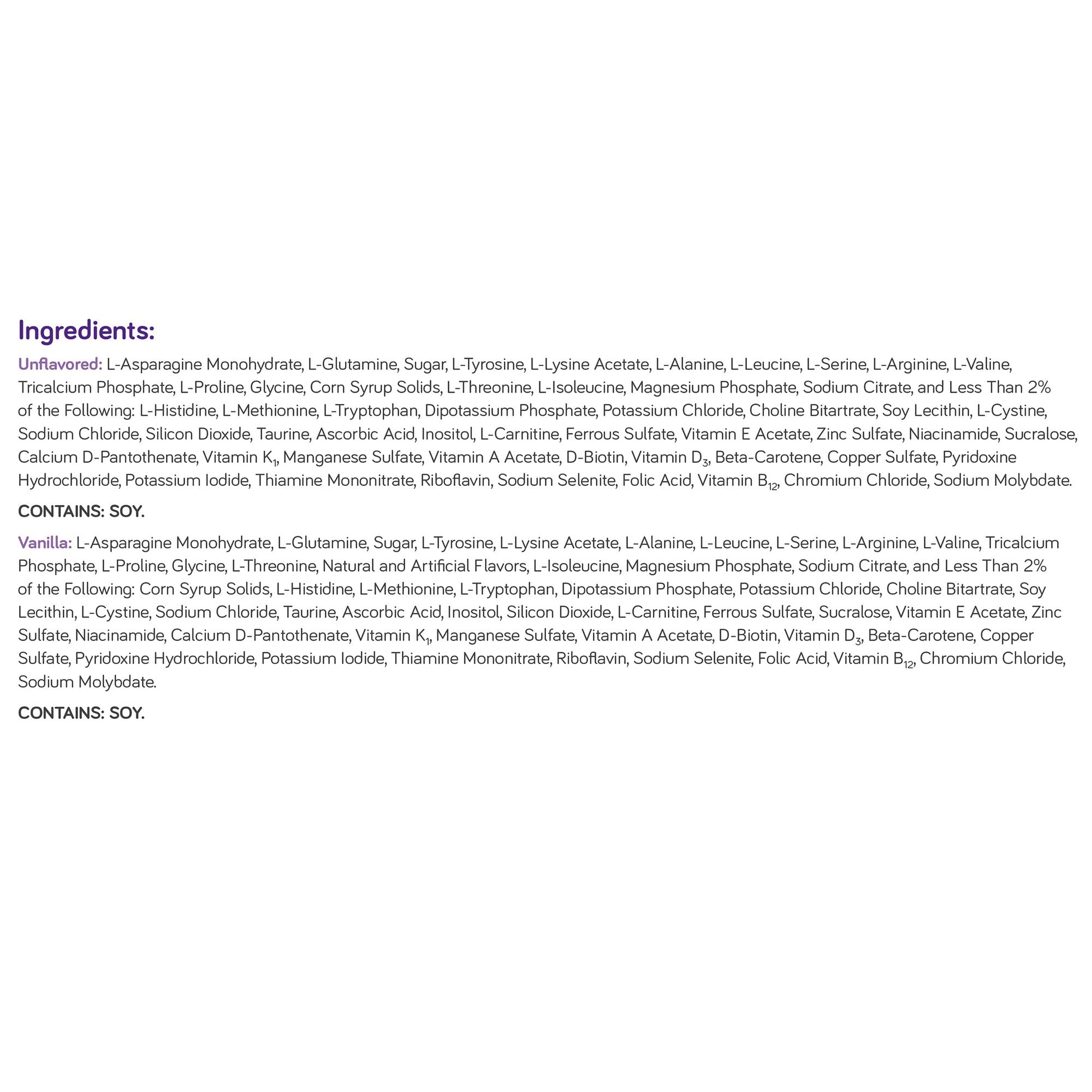 - Ingredients: L-Asparagine Monohydrate, L-Glutamine, Sugar, L-Tyrosine, L-Lysine Acetate, L-Alanine, L-Leucine, L-Serine, L-Arginine, L-Valine, Tricalcium Phosphate, L-Proline, Glycine, Corn Syrup Solids, L-Threonine, L-Isoleucine, Magnesium Phosphate, Sodium Citrate, and Less Than 2% of the Following: L-Histidine, L-Methionine, L-Tryptophan, Dipotassium Phosphate, Potassium Chloride, Choline Bitartrate, Soy Lecithin, L-Cystine, Sodium Chloride, Silicon Dioxide, Taurine, Ascorbic Acid, Inositol, L-Carnitine, Ferrous Sulfate, Vitamin E Acetate, Zinc Sulfate, Niacinamide, Sucralose, Calcium D-Pantothenate, Vitamin K1, Manganese Sulfate, Vitamin A Acetate, D-Biotin, Vitamin D3, Beta-Carotene, Copper Sulfate, Pyridoxine Hydrochloride, Potassium Iodide, Thiamine Mononitrate, Riboflavin, Sodium Selenite, Folic Acid, Vitamin B12, Chromium Chloride, Sodium Molybdate. Contains Soy