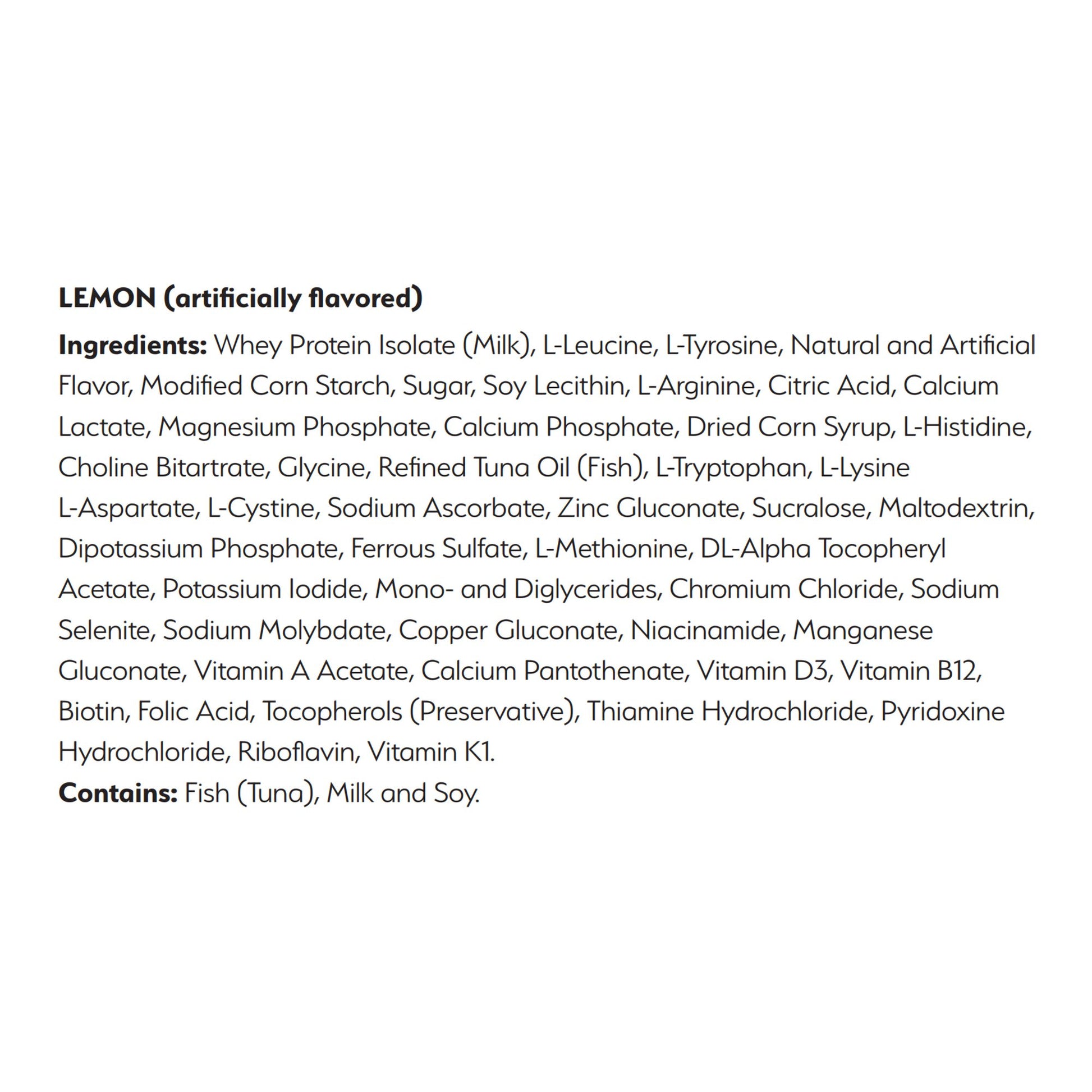 - Ingredients: Whey Protein Isolate (Milk), L-Leucine, L-Tyrosine, Natural and Artificial Flavor, Modified Corn Starch, Sugar, Soy Lecithin, L-Arginine, Citric Acid, Calcium Lactate, Magnesium Phosphate, Calcium Phosphate, Dried Corn Syrup, L-Histidine, Choline Bitartrate, Glycine, Refined Tuna Oil (Fish), L-Tryptophan, L-Lysine L-Aspartate, L-Cystine, Sodium Ascorbate, Zinc Gluconate, Sucralose, Maltodextrin, Dipotassium Phosphate, Ferrous Sulfate, L-Methionine, DL-Alpha Tocopheryl Acetate, Potassium Iodide, Mono- and Diglycerides, Chromium Chloride, Sodium Selenite, Sodium Molybdate, Copper Gluconate, Niacinamide, Manganese Gluconate, Vitamin A Acetate, Calcium Pantothenate, Vitamin D3, Vitamin B12, Biotin, Folic Acid, Tocopherols (Preservative), Thiamine Hydrochloride, Pyridoxine Hydrochloride, Riboflavin, Vitamin K1