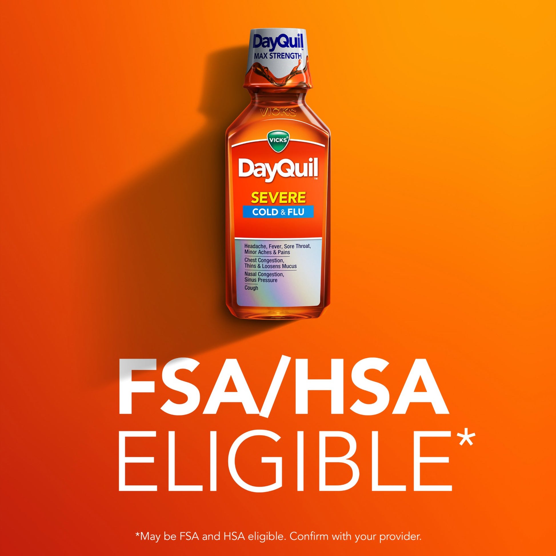 - DayQuil Severe Cold & Flu helps you get on with your day, even when you are experiencing coughing, stuffy nose, minor body pain, chest congestion, sinus congestion, sinus pressure, sore throat, headache and fever.
