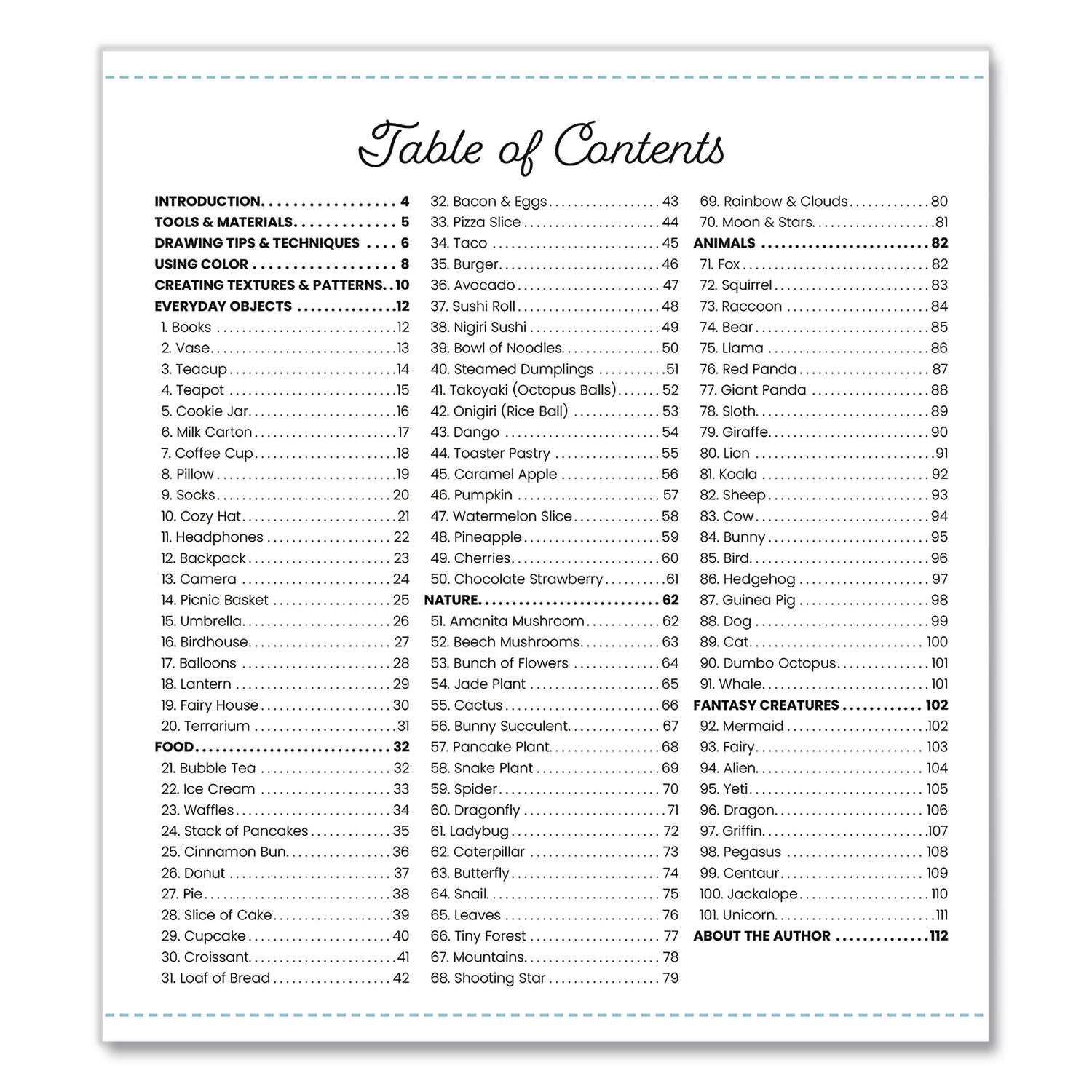 Learn to draw tons of cute and quirky stuff with more than 100 step-by-step drawing projects in the Quatro 101 Super Cute Things to Draw Book. This drawing book is perfect for beginners, as well as young artists, with its simple illustrations and easy-to-follow drawing steps. You'll learn to draw everyday objects including a teapot, balloons and a terrarium; food, including a cinnamon bun, a sushi roll and strawberries; nature, including a mushroom, a tiny forest and a rainbow and cloud; animals, including a red panda, a sloth and a cow; mythical creatures, including a yeti, a dragon and a jackalope. For those who want to learn how to draw everything adorable and amusing, this book is for you.
