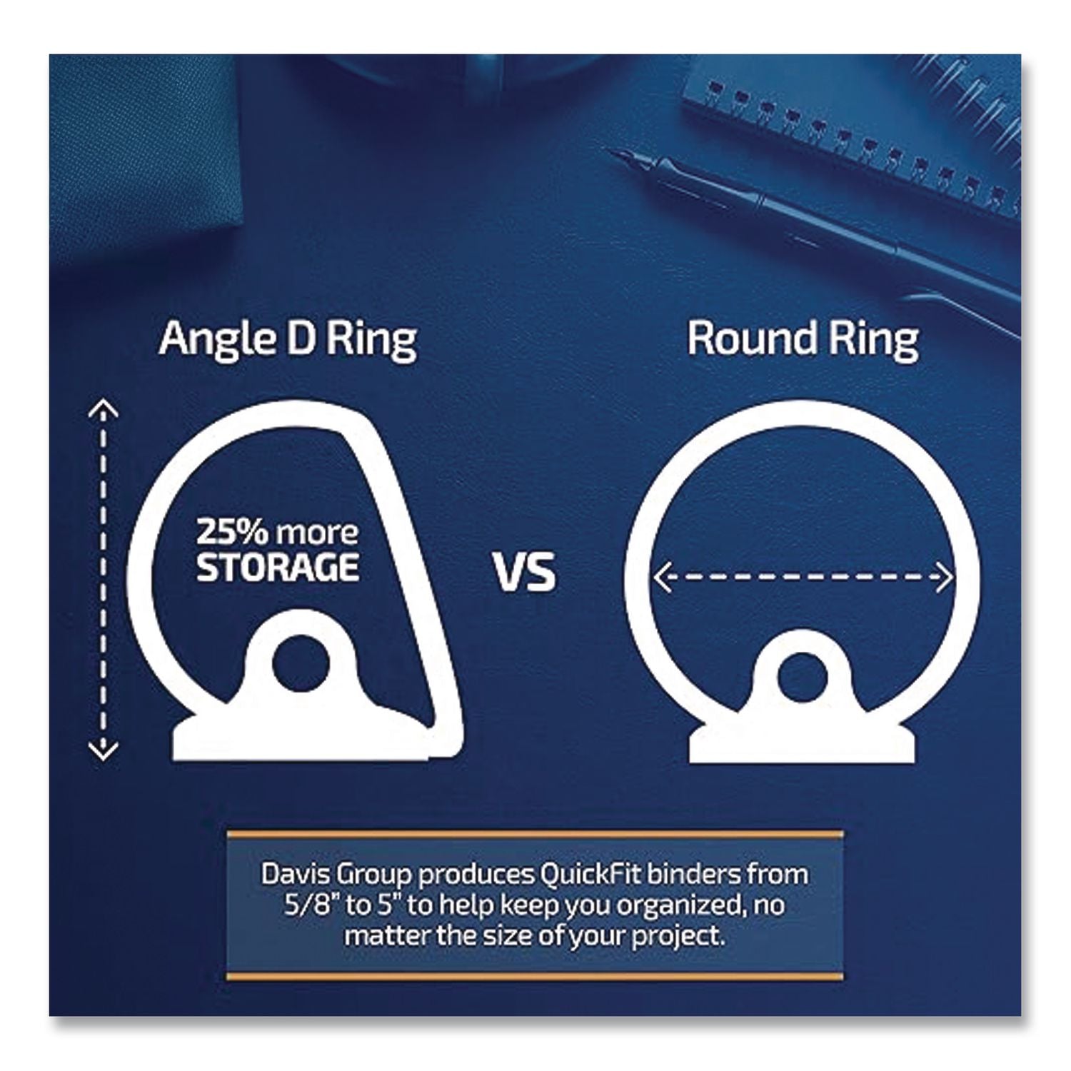 Features a unique QuickFit® overlay design that allows you to use a single sheet of paper to create a custom one-piece presentation insert that wraps around the spine to the the front cover for easy insertion and quick identification. The angled D-rings hold 25 percent more pages than standard round rings of the same size, making the binder ideal where space is at a premium.