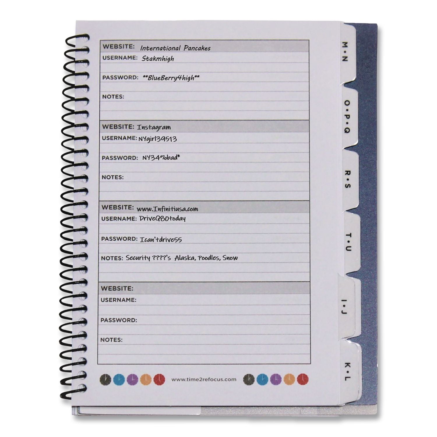 Make life easier and keep all of your password information together in one convenient location. Twelve, 1/6-cut alpha tabs help you organize your various accounts, so you can flip directly to the entry you need. A standardized entry format provides boxes for the website, username and password along with space for notes and security questions. Sturdy bend-, tear- and scratch-resistant cover along with premium paper stock helps ensure your important information is kept neat and clean.
